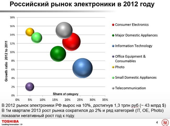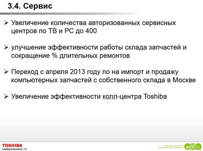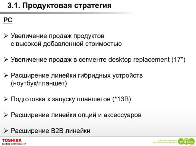 Ключевыми компонентами стратегии компании Toshiba на рынке в 2013 году будут: