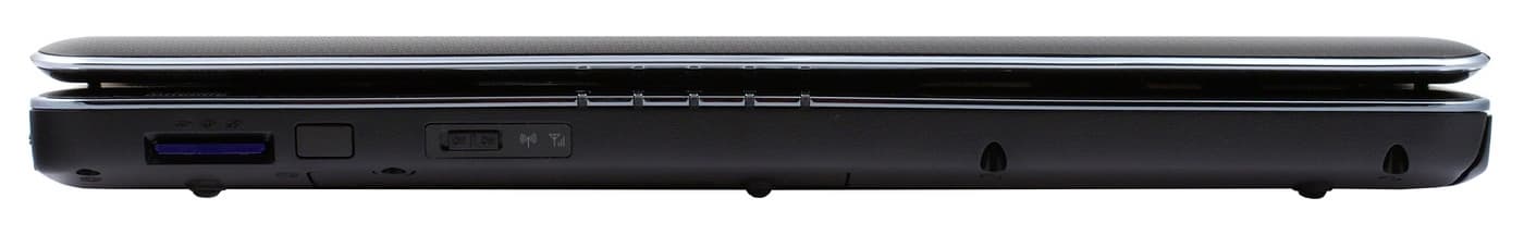 На передней грани нет разъемов, в которые подключаются штекеры, это очень удобно с точки зрения эргономики. В левой части расположен картовод. Карточка формата SD утапливается в него полностью, ноутбук можно без проблем носить с вставленной картой.