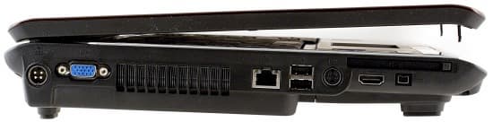 Дальше сгруппированы: разъем для проводной сети RJ-45, два порта USB 2.0, выход S-Video (с 4 штырьками). Еще правее расположен разъем Expresscard, а под ним – цифровой разъем HDMI, а также маленький разъем IEEE1394 FireWire, который используется для подключения электронной бытовой техники.
