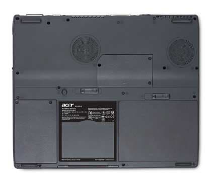Еще одна непривычная для ноутбуков Acer деталь переднее расположение модуля DVD-CD/RW. Опять-таки сказывается «настольное» предназначение модели. В результате окошко ИК-порта «съехало» вправо. Рядом с ним кнопка выключения/индикатор работы беспроводной сети (при включении светится синим). Левую часть переднего торца занимают кнопки управления воспроизведением CD.