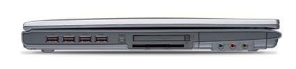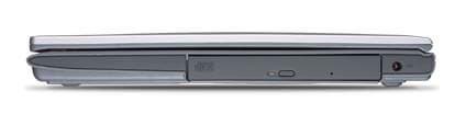 Справа отсек AcerMedia Bay с оптическим накопителем и разъем для подключения источника питания. Здесь стоит отметить, что штекер источника имеет «Г»-образную форму, поэтому надо следить, чтобы провод не мешал открываться лотку привода.