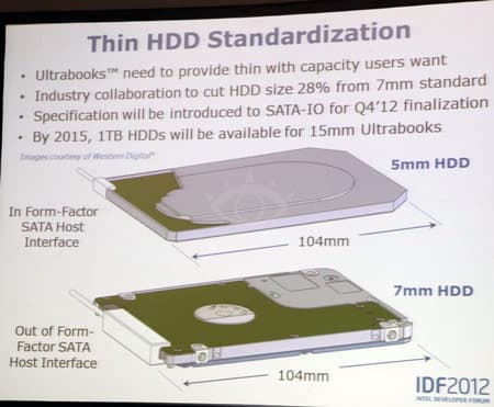 Второе, не побоюсь этого слова, стратегическое направление совершенствования конфигурации ультрабуков — уменьшение толщины и вообще размеров корпуса. Причем сейчас основные усилия производителей сосредоточены на создании и производстве сверхтонких компонентов. Активно идет внедрение более тонких вентиляторов, диск стремительно переходят на стандарт 7 мм, причем производители особо подчеркивают применимость их продуктов для ультрабуков. Однако Intel даже на этом не хочет останавливаться, требуя от производителей жестких дисков толщиной всего 5 мм. При такой толщине уже даже размер разъема SATA становится ограничивающим фактором. То же, кстати, начинают делать и производители SSD.