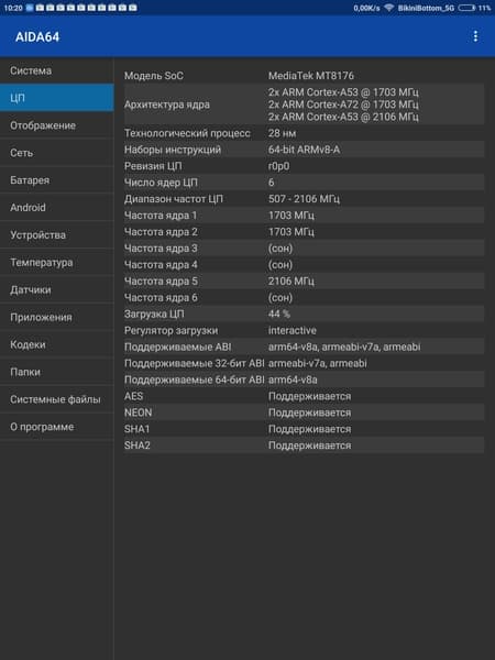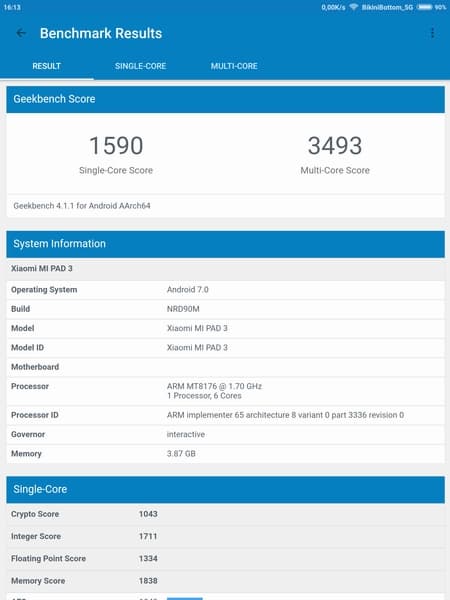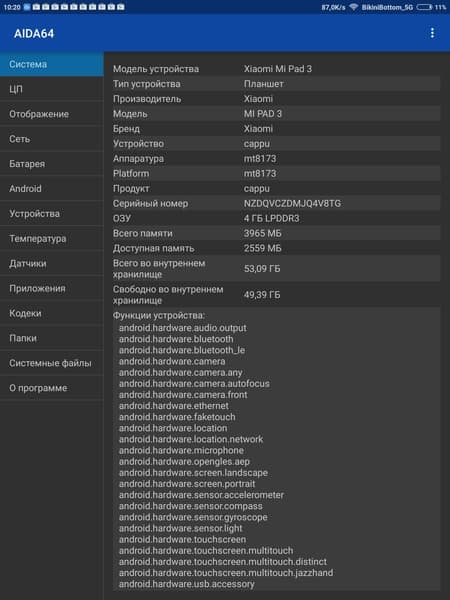 Аппаратная платформа Xiaomi Mi Pad 3 строится на шестиядерной SoC MediaTek MT8176. В конфигурацию чипа входят два процессорных ядра ARM Cortex-A72 с максимальной частотой до 2,1 ГГц и четыре ядра ARM Cortex-A53 с частотой до 1,7 ГГц. За обработку графики отвечает видеоускоритель PowerVR Roque GX6250. Объем оперативной памяти (LPDDR3) в рассматриваемой конфигурации составляет 4 ГБ, а встроенной флэш-памяти (eMMC 5.0) — 64 ГБ. Из них свободно около 3 ГБ ОЗУ и 49 ГБ места в хранилище. Возможность расширения памяти за счет установки карт microSD не предусмотрена.