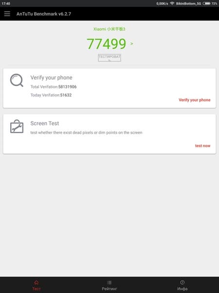 MT8176 — это прошлогодний шестиядерный чип, который MediaTek подготовила специально для планшетных компьютеров. SoC выполнена по техпроцессу 28 нм. По производительности это решение уверенного среднего уровня, в тесте AnTuTu герой обзора набрал около 77,5К очков. Впрочем, предыдущая модель Mi Pad 2 со своей SoC Intel Atom Z8500 набирала не намного меньше (около 76К баллов).