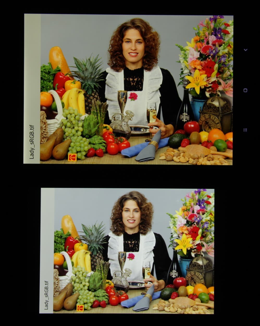 Насыщенность цветов на экране Xiaomi Mi Pad 3 нормальная, цвета близки к естественным, но изображение чуть затемнилось. Цветовой баланс у Nexus 7 и тестируемого экрана различается незначительно. Фотография получена при выбранном по умолчанию профиле Automatic contrast в настройках экрана: