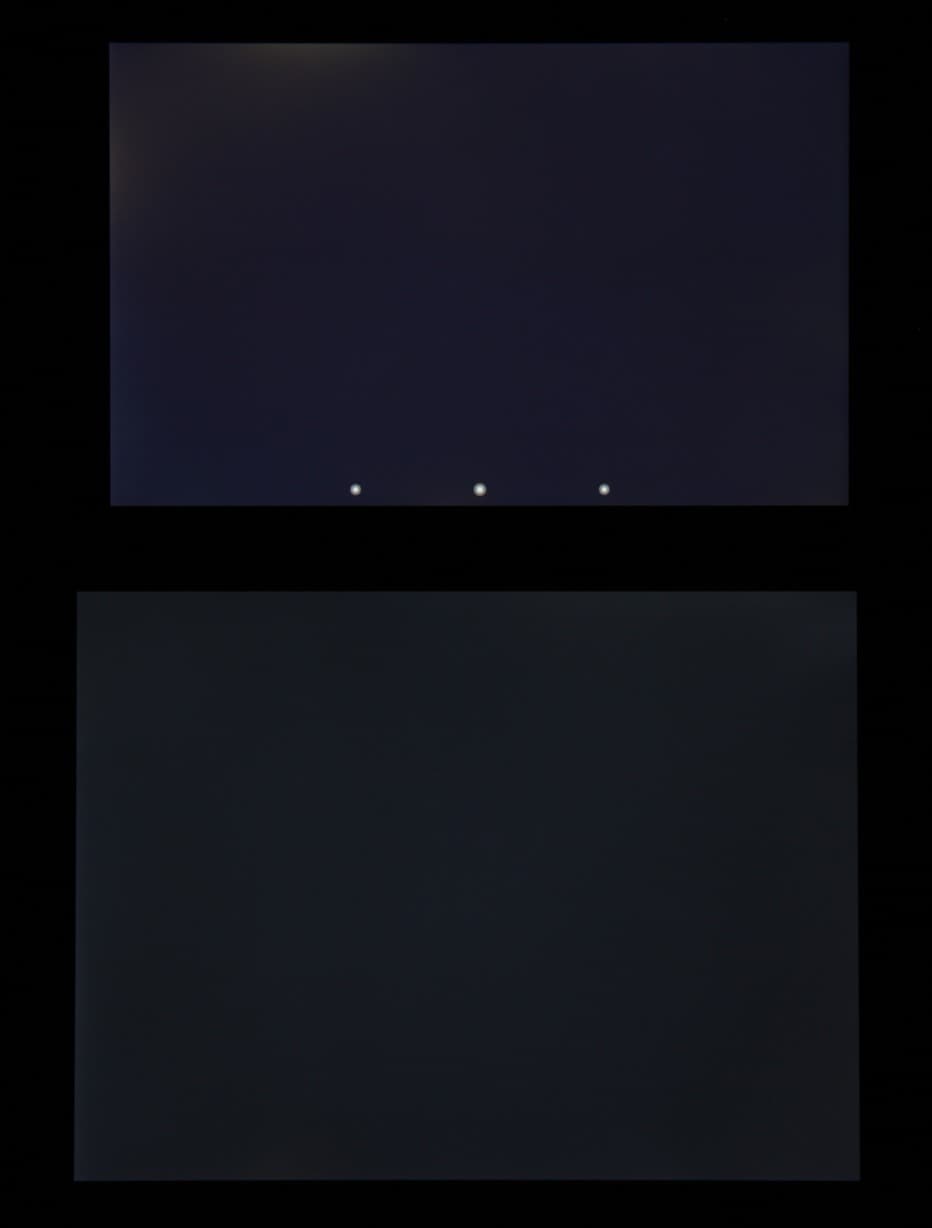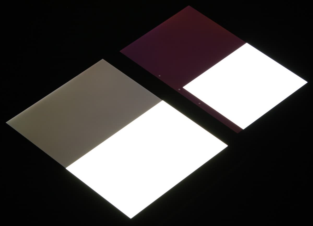 При перпендикулярном взгляде равномерность черного не идеальная, так как по краю есть участки с немного с повышенной яркостью черного. Впрочем, у конкурента дела обстоят не намного лучше: