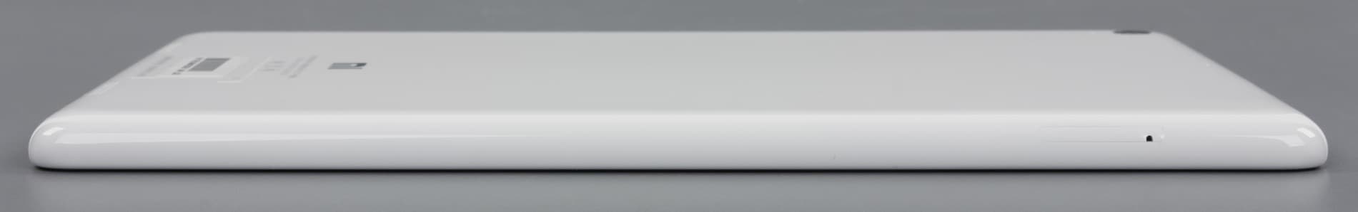 Дисплей целиком обхватывает изогнутая тыловая панель с обтекаемыми гранями. Unibody-дизайн добавляет планшету солидности, но удерживать его в одной руке из-за этого довольно неудобно. Хотя большую роль здесь, конечно, играет материал задней панели — пластик, очень похожий на тот, что использовался в iPhone 5c. Но если за счет размера и широких боковых граней в смартфоне неудобства практически сводились на нет, то в нашем случае уверенно удерживать планшет одной рукой оказалось проблематично.