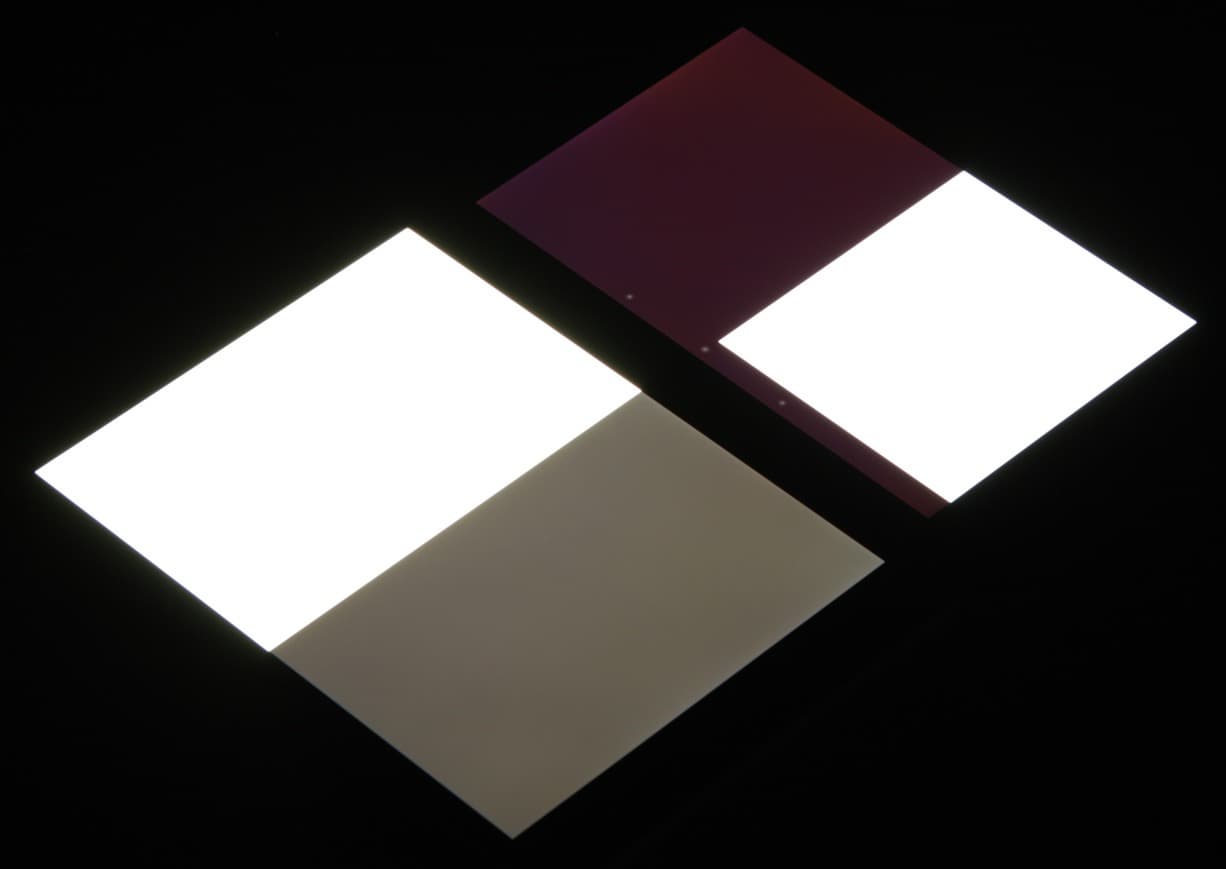 Яркость под углом у обоих планшетов заметно уменьшилась (как минимум в 4 раза, исходя из разницы в выдержке), но в случае Xiaomi MiPad яркость экрана под этим углом все же выше. Черное поле при отклонении по диагонали высветляется очень сильно, но остается примерно нейтрально-серым. Фотография с Nexus 7 для сравнения это показывает (яркость белых участков в перпендикулярном направлении у обоих планшетов примерно одинаковая):
