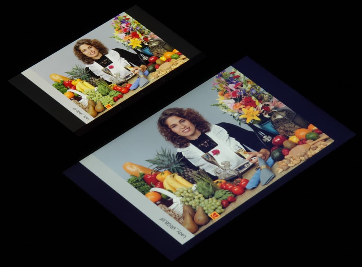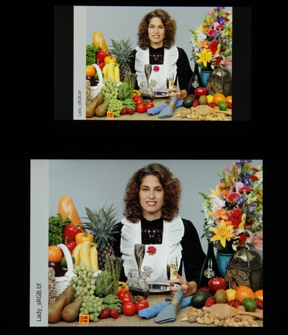Видно, что цветопередача немного различается и изображение на ZT-10003G менее насыщенное (обратите внимание, например, на бананы), но это единственный обоснованный вывод, который можно сделать по фотографии. И белое поле: