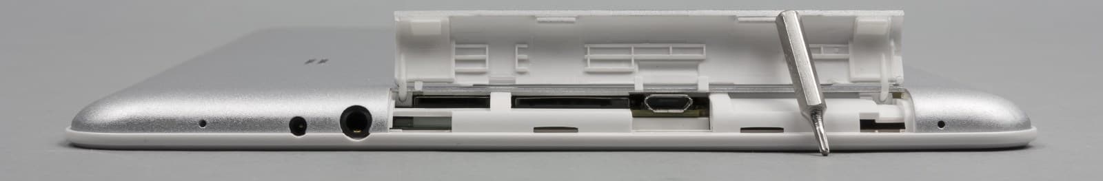 Под пластиковой крышкой находятся разъемы Mini-SIM и microSD, никак не помеченные и потому едва заметные. Рядом — порт Micro-USB. Крышка открывается с трудом, необходимо с силой поддевать прорези на ней ногтем. Через несколько таких операций образуется зазор между ней и тыловой панелью.