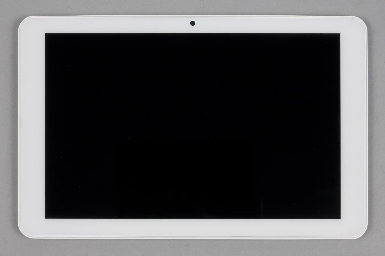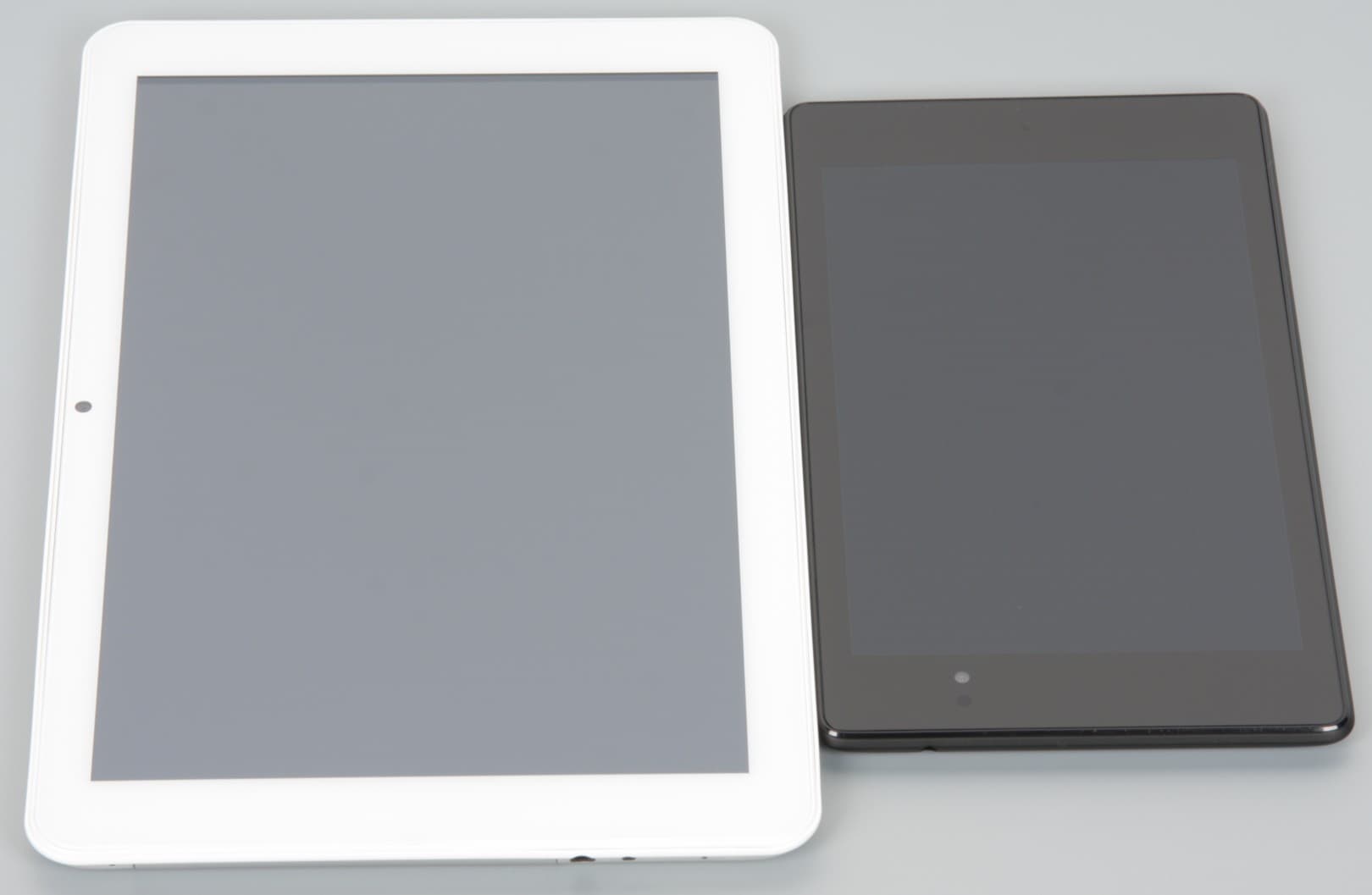 Лицевая поверхность экрана выполнена в виде стеклянной пластины с зеркально-гладкой поверхностью, устойчивой к появлению царапин. Судя по отражению объектов, возможно, есть какой-то антибликовый фильтр, который по снижению яркости отражения заметно хуже, чем у Google Nexus 7 (2013) (далее мы сравниваем именно с ним). Для наглядности приведем фотографии, на которых в выключенных экранах обоих планшетов отражается белая поверхность (Zifro ZT-10003G — слева, далее их можно различать по размеру):