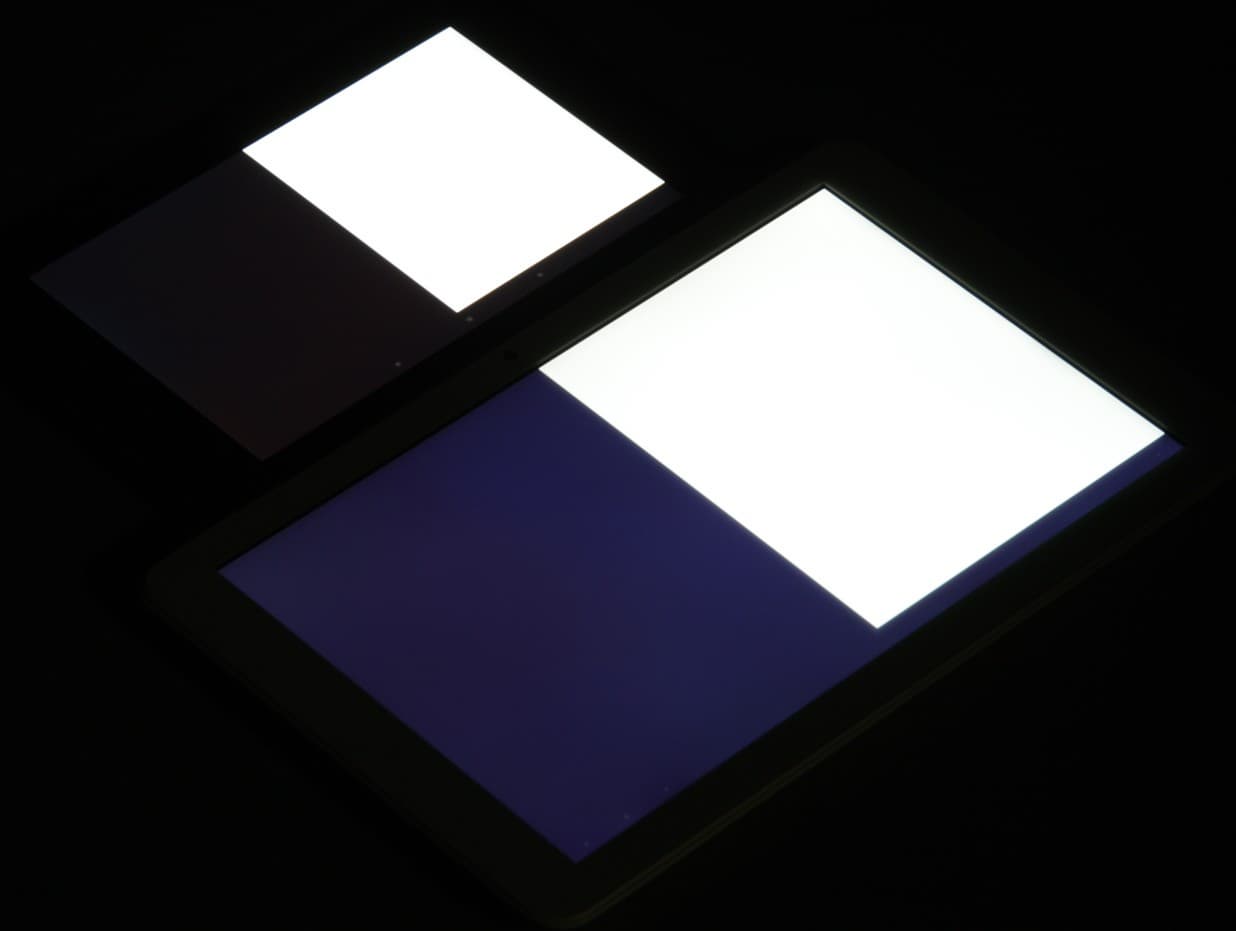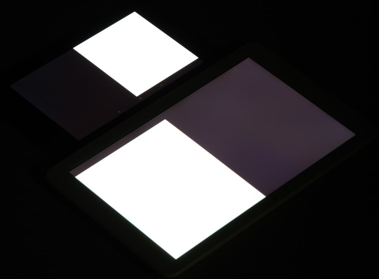 Яркость под углом у обоих планшетов заметно уменьшилась (как минимум в 5 раз, исходя из разницы в выдержке) и падение яркости примерно одинаковое. При этом цветовой тон изменился несильно. Черное поле при отклонении по диагонали высветляется очень сильно и приобретает красно-фиолетовый или фиолетовый оттенок. Фотография с Nexus 7 для сравнения это показывает (яркость белых участков в перпендикулярном направлении у обоих планшетов одинаковая!):