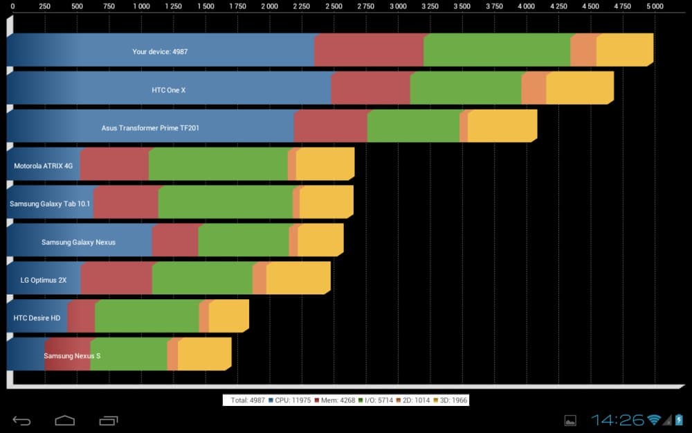 В комплексных бенчмарках более скромная производительность процессора компенсируется более скромным разрешением, в результате чего наш герой выходит на один уровень с Full HD-решениями на Rockchip RK3188.