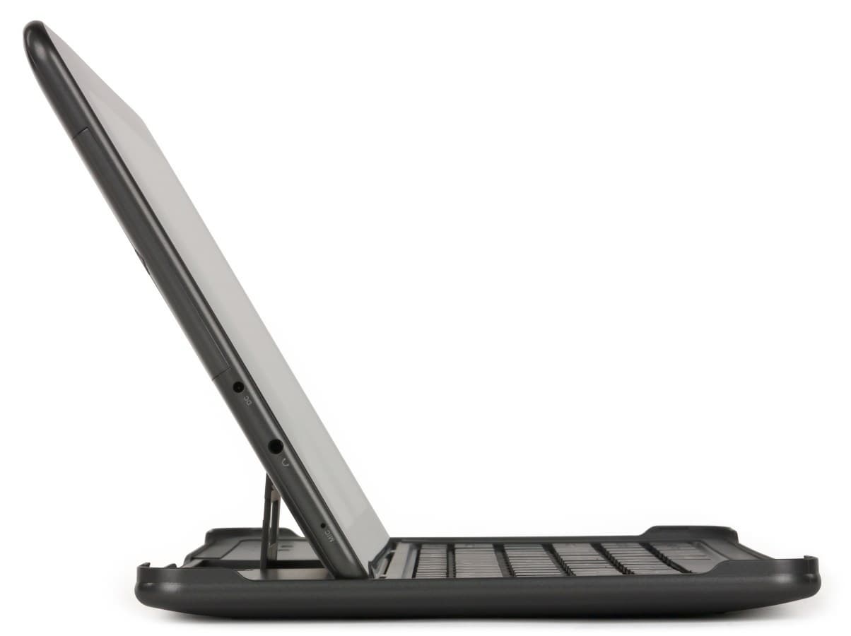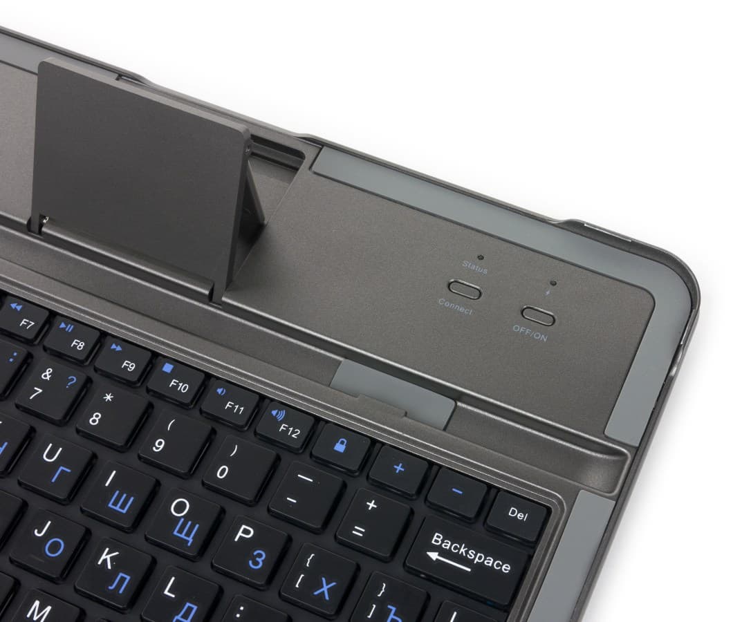 Комплектная клавиатура соединяется с планшетом посредством Bluetooth и имеет выдвижную подставку, которая откидывается, если сдвинуть ползунок слева от нее.