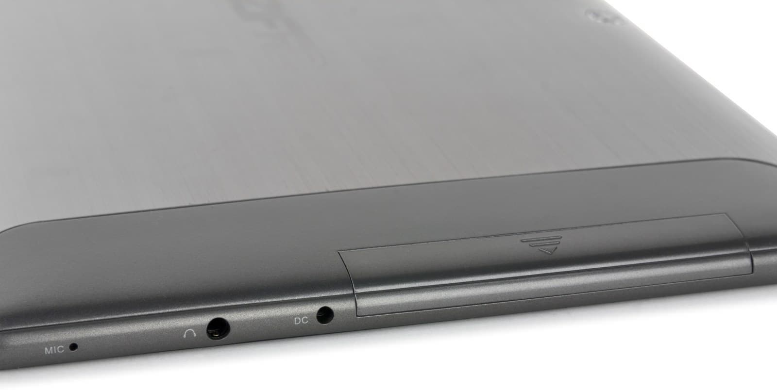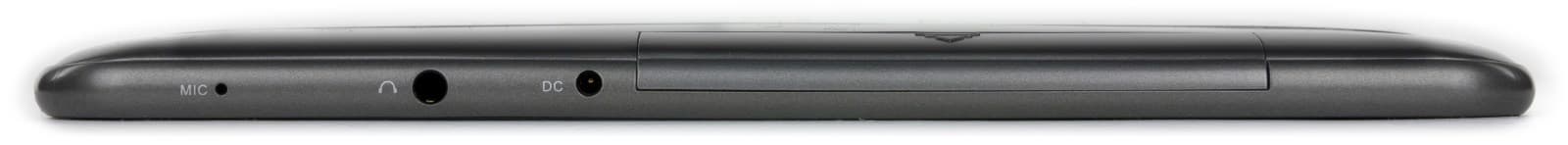 Слева мы видим отверстие микрофона, а также гнезда для подключения сетевого адаптера и наушников. В ноутбучном режиме с клавиатурой подключенные к планшету проводные наушники работе не мешают.