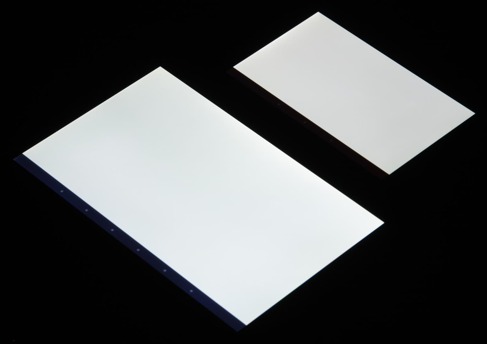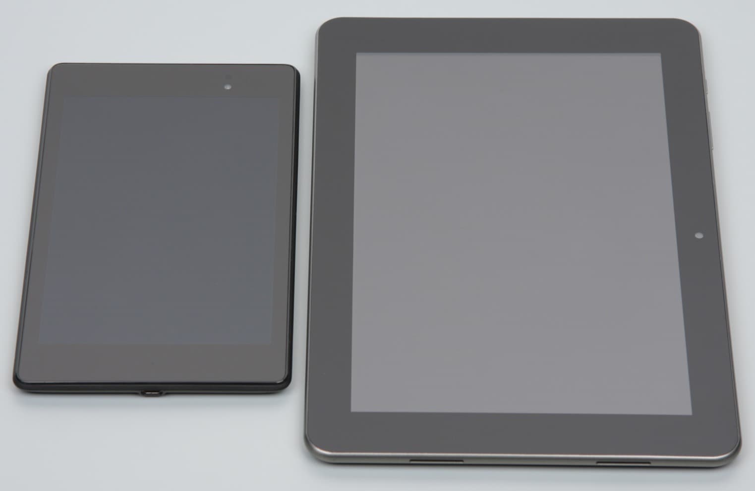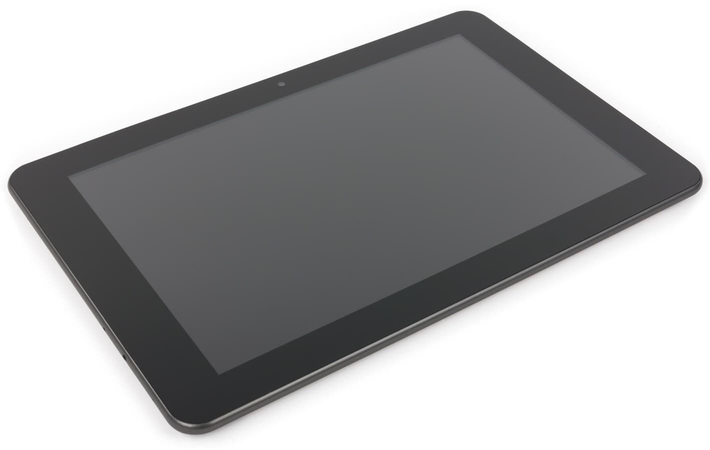 Лицевая поверхность экрана выполнена в виде стеклянной пластины с зеркально-гладкой поверхностью, устойчивой к появлению царапин. Судя по яркости отраженных объектов, антибликовые свойства экрана хуже, чем у Google Nexus 7 (2013) (далее просто Nexus 7). Для наглядности приведем фотографию, на которой в выключенных экранах обоих планшетов отражается белая поверхность (Zifro ZT-1001KB — справа, далее их можно различать по размеру):