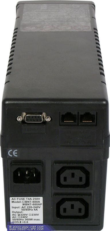 На задней панели расположены разъем RS-232 для подключения управляющего кабеля, один вход и выход RJ-11 (для телефона/факса), две розетки для подключения нагрузки (IEC-320), а также разъем для подключения питания устройства.