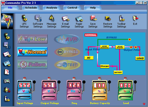 Поставляемое с ИБП ПО — Commander Pro, точно такое же, как у ИБП Ippon Back Power Pro 600, поэтому подробно рассматривать его не будем. Единственное, что хотелось бы отметить: ПО позволило управлять Titan 1K, корректно определив его тип (см. схематическое изображение ИБП), хотя и не смогло определить модель устройства.