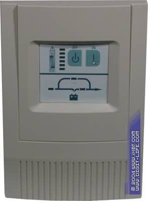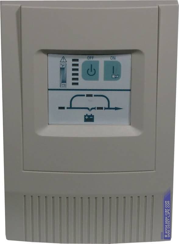Вполне «взрослая» панель, характерная для большинства онлайновых ИБП — на ней отражается максимум информации о работе устройства: 6-секционный индикатор разряда акуумулятора/перегрузки, две разнесенные кнопки включения и выключения ИБП, схематичное изображение тракта подачи напряжения.