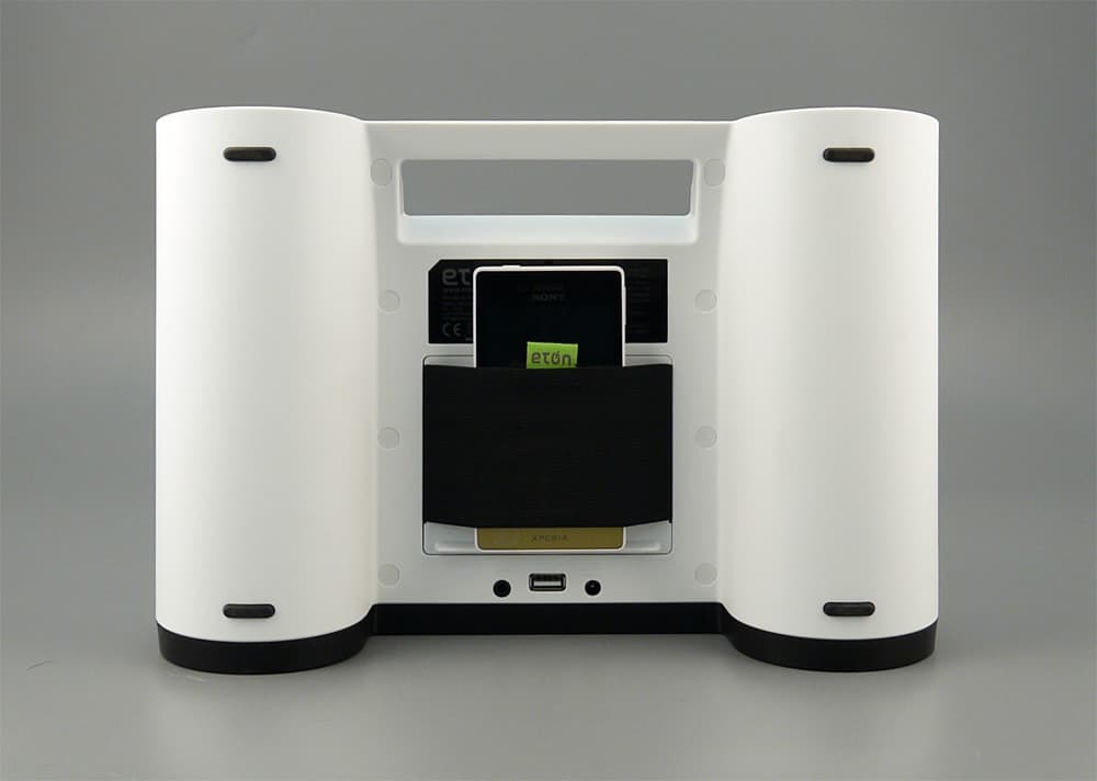 Одну из поверхностей почти целиком занимает солнечная батарея, а на противоположной стороне есть ниша, в которую выходят разъемы USB, AUX (3,5 мм) и для подключения штатного блока питания; ее глубина вполне позволит расположить устройство горизонтально даже с подключенными кабелями. Там же есть клапан из прорезиненной ткани, в который можно вставить смартфон.