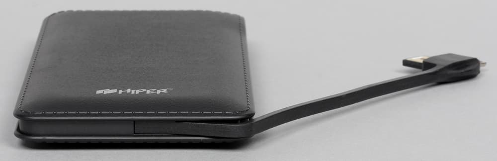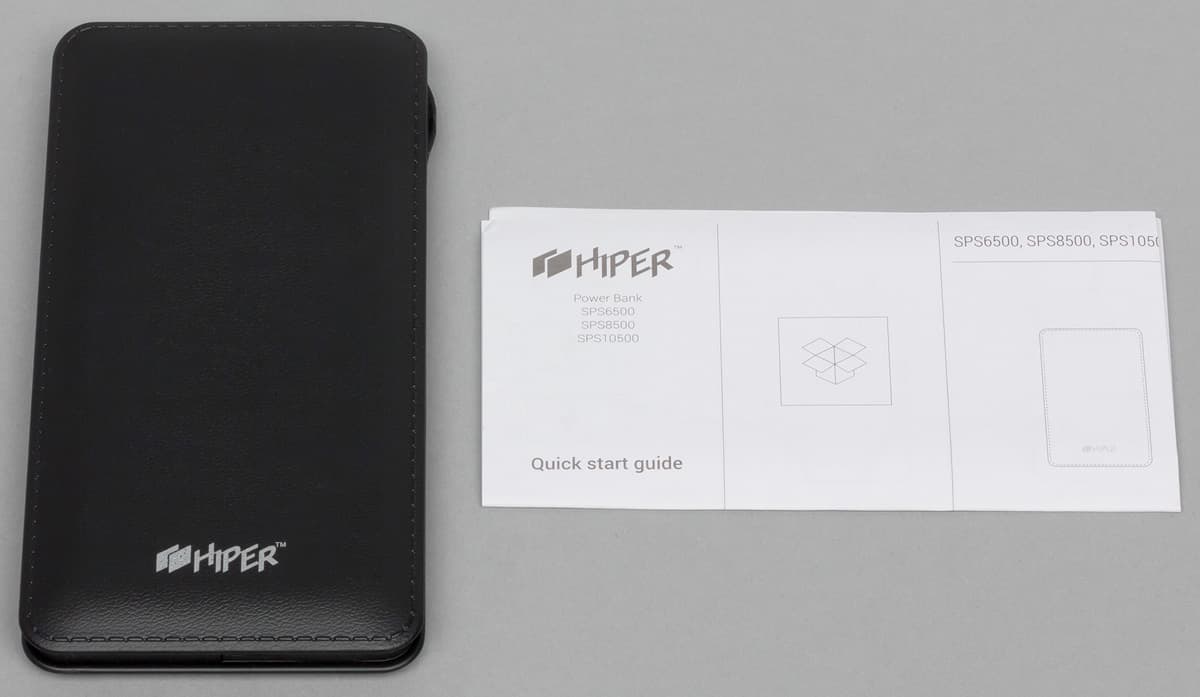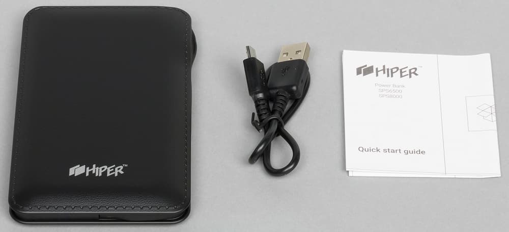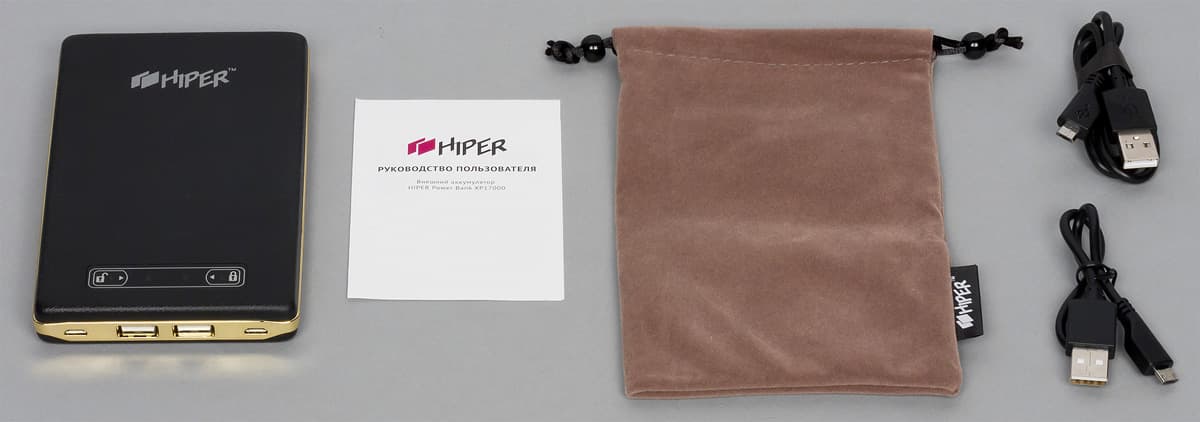 Комплектация в сравнении с другими подобными аппаратами Hiper максимально богатая: два кабеля USB—Micro-USB (разной длины: 23 и 53 см, жаль только, что без маркировки — заявленные входные и выходные токи велики, и было бы интересно уточнить сечение проводов), чехол-кисет из бархатистого материала, в который без труда войдет и сам пауэрбанк, и оба кабеля, а также инструкция на русском языке (правда, ее содержание оставляет желать лучшего: слишком уж краткое).