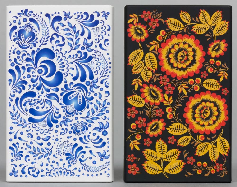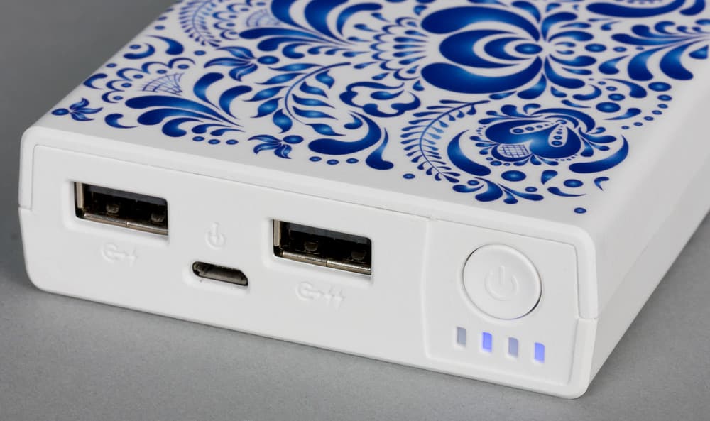 Оба входящих в «Русскую серию» внешних аккумулятора — это RP11000, один имеет белый корпус с сине-голубыми узорами, изображающими стилизованные цветы (Гжель), у второго корпус черный с красно-желтыми цветами и листьями (Хохлома). Еще одна особенность — покрытие soft-touch; имеется ли такое у серии RP, мы сказать не можем, поскольку у нас побывали только варианты из «Русской серии».