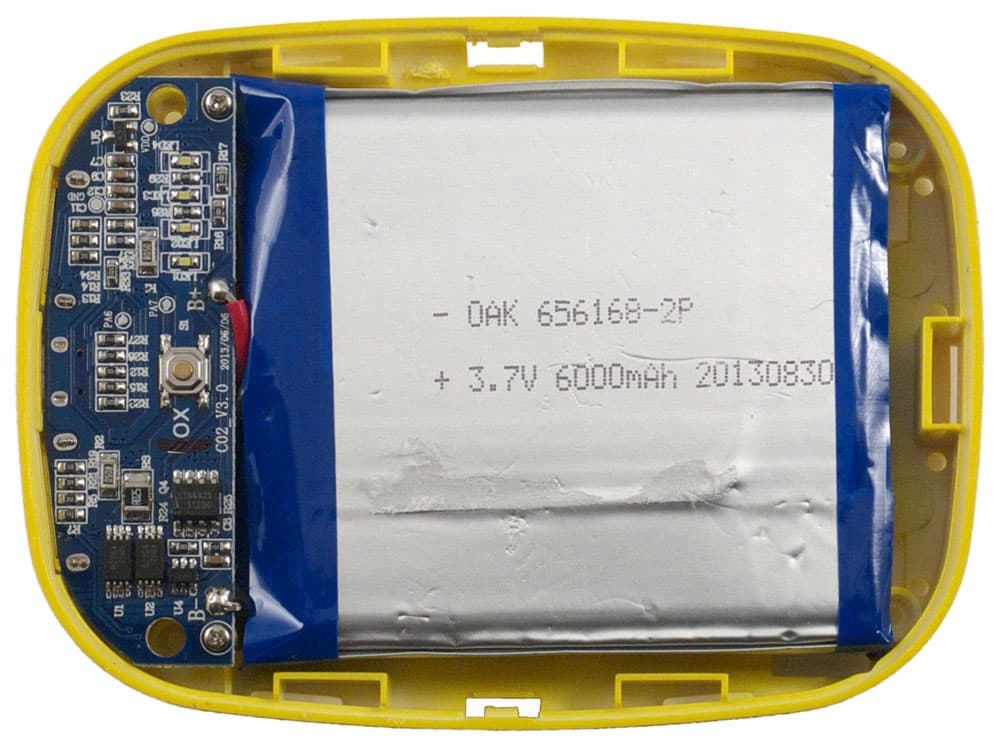 В качестве батареи использованы две параллельно соединенные ячейки с общей маркировкой «3,7 V 6000 mAh», соответственно накопленная в аккумуляторе энергия должна составить 22,2 Вт·ч. Конечно, полностью эта энергия быть отдана в нагрузку не может: глубокий разряд аккумулятора недопустим, да к тому же КПД преобразователя, с помощью которого из напряжения батареи 3,7 В получается 5 В, не равен 100%.