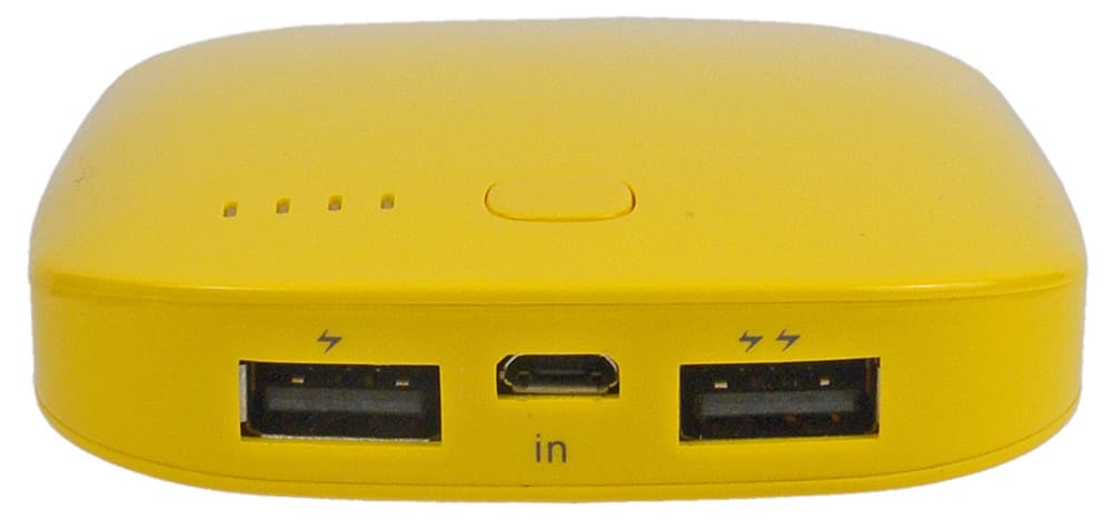 На одном из торцов разместились два выходных разъема USB и входной Micro-USB. Согласно спецификации, выходы различаются максимальным током; более мощный помечен двумя символами молнии, у менее мощного молния одна, причем эти символы хоть и крошечные, но нанесены контрастным цветом, а потому хорошо заметны.