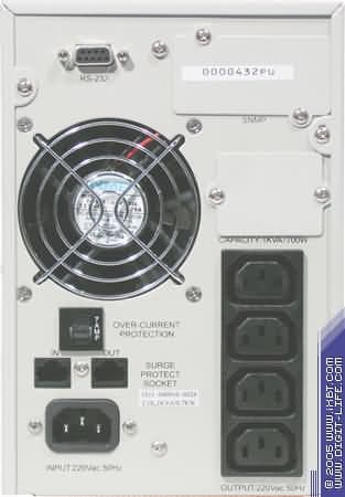 На задней панели — стандартный набор разъемов: три розетки для подключения оборудования с запиткой от аккумулятора, разъем подключения оборудования без запитки от аккумулятора (только с гашением скачков напряжения), пара разъемов RJ-45, крышка отсека предохранителя, интерфейс коммуникационного порта. Источник не имеет гнезда для подключения к сети питания, поскольку оснащен фиксированным проводом питания