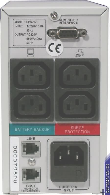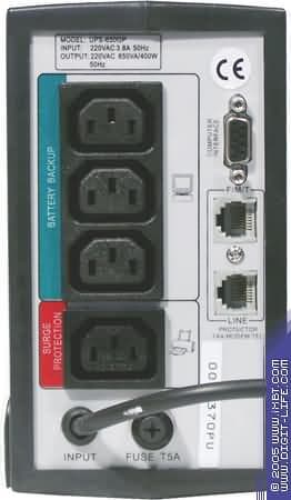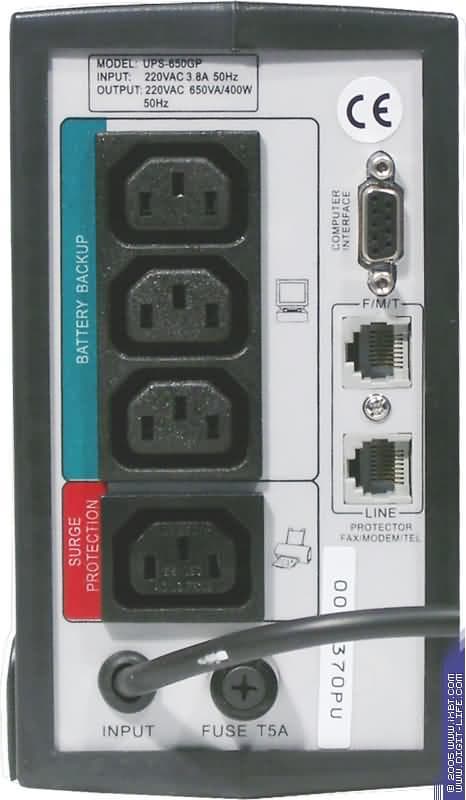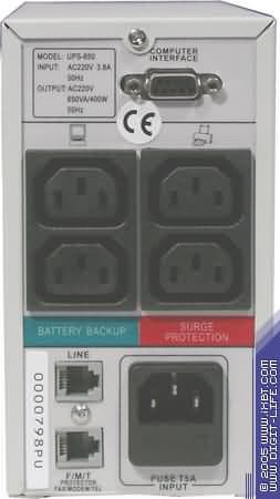 На задней панели — стандартный набор разъемов: две розетки для подключения оборудования с запиткой от аккумулятора, два разъема подключения оборудования без запитки от аккумулятора (только с гашением скачков напряжения), розетка подключения ИБП к сети, пара разъемов RJ-11 (вход и выход для подключения телефона/модема), интерфейс коммуникационного порта.