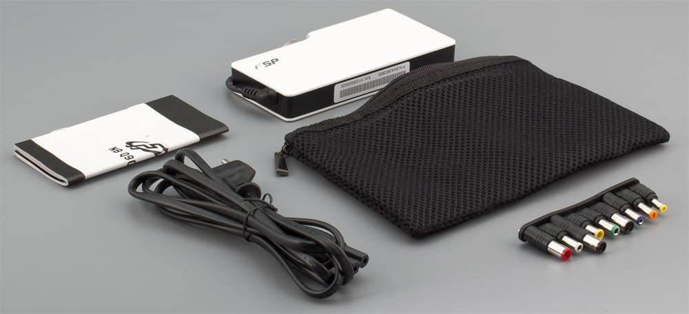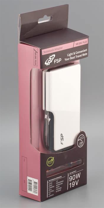 Еще один «испытуемый» в нашей коллекции — универсальный сетевой адаптер NB Q90 Plus от известного производителя компьютерных блоков питания FSP Group Inc. Он предназначен для питания мобильных устройств, требующих напряжения 18–20 В.