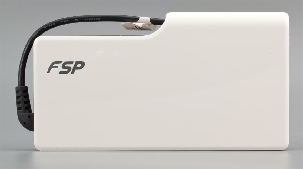 Адаптер поставляется в корпусах нескольких цветов, нам достались белый и черный. На крышке устройства имеется логотип изготовителя — буквы FSP, первая из которых подсвечивается синим цветом при включении. На одной из торцевых поверхностей есть специальный слот, куда можно убрать несъемный выходной кабель.