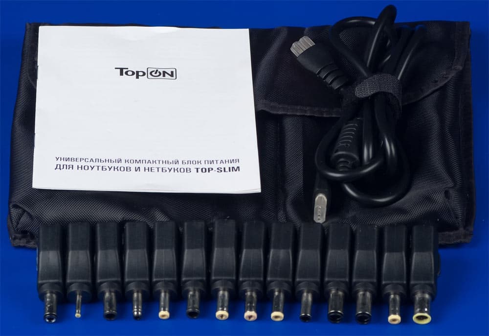 В комплекте имеются семь Г-образных входных переходников (они нужны для зарядки TOP-UB от блока питания ноутбука), а также кабель длиной 70 см с восемью переходниками для соединения с разъемом питания ноутбука. Сечение кабеля (0,8 мм²/18AWG) достаточно для подключения нагрузки с заявленной мощностью.