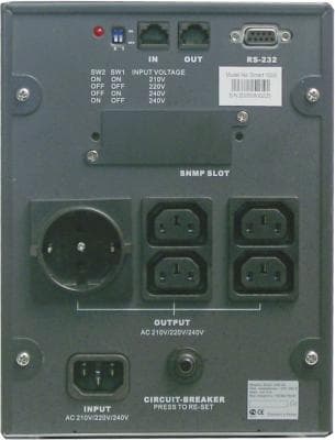На задней панели — светодиодный индикатор наличия «земли», при подключении нагрузки сразу будет видно есть эффективное заземление или нет, что очень важно знать в целях соблюдения необходимых правил и мер безопасности; 4 розетки IEC320 и одна розетка «евростандарт» (для подключения размножителя, например) — все розетки обеспечивают нагрузке автономный режим в случае пропадания электроснабжения (то есть с запиткой от аккумулятора); розетка для подключения ИБП к сети, разъем RS-232 для подключения управляющего провода к системному блоку, два разъема RJ-45 (вход и выход) для подключения сетевого оборудования, например, локальной линии интернета; два DIP-переключателя, задающих диапазон входного напряжения (от 210 до 240 В), автоматический предохранитель от перегрузок и закрытое заглушкой посадочное место SNMP-модуля.