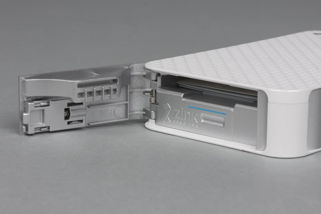 При нажатии белой кнопки на боковой грани открывается нижняя часть верхней панели. Сюда вставляется лента с красителями. Одной ленты хватает на печать десяти снимков.