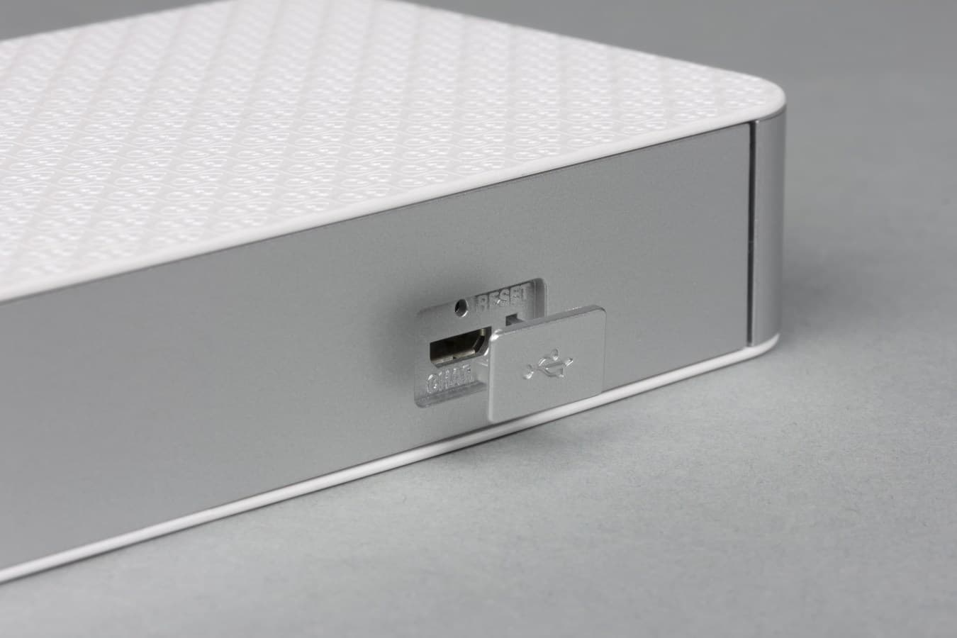 Справа за заглушкой — разъем Micro-USB для зарядки и отверстие для принудительной перезагрузки. Принтер легко заряжается от USB-порта компьютера.