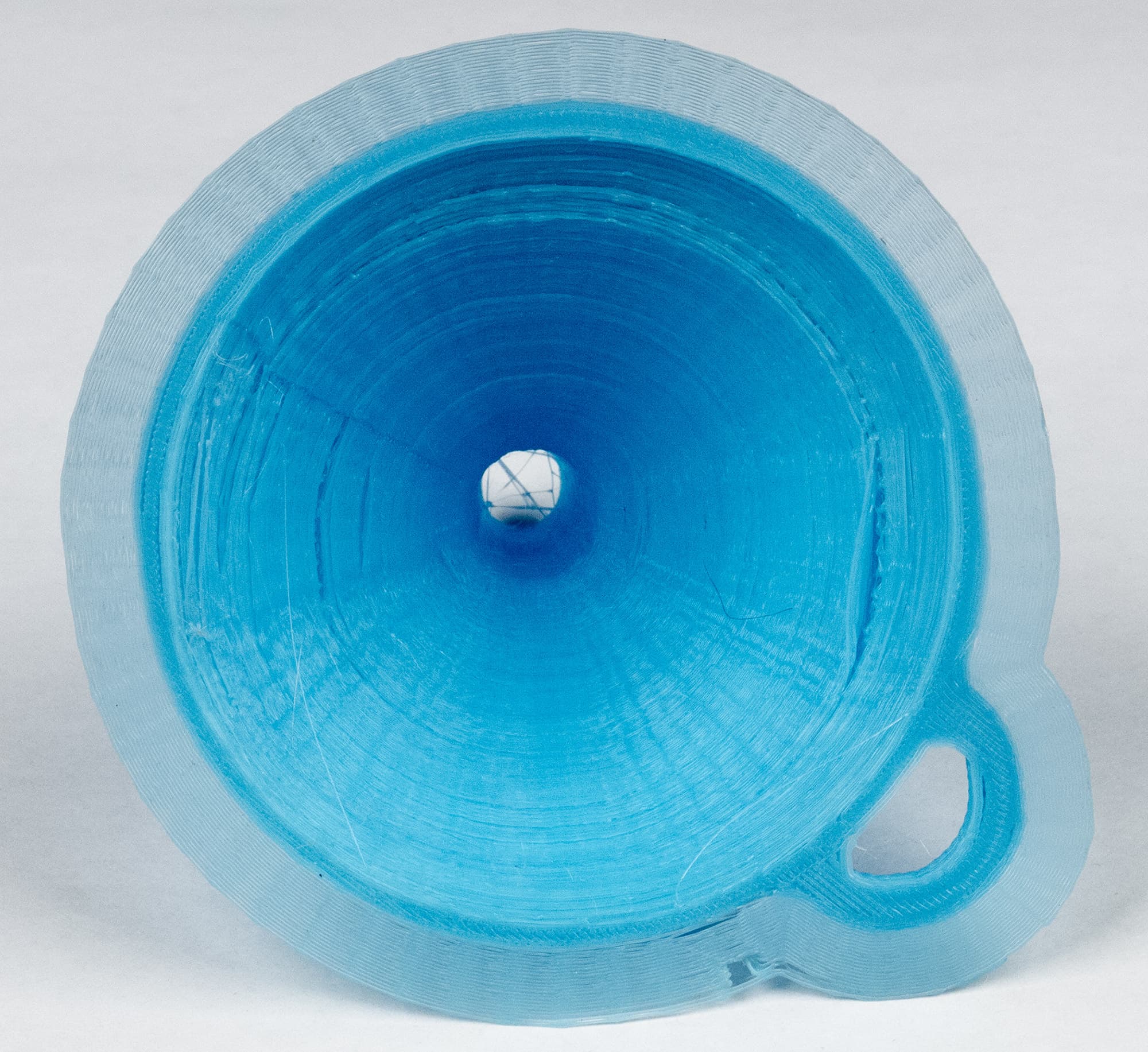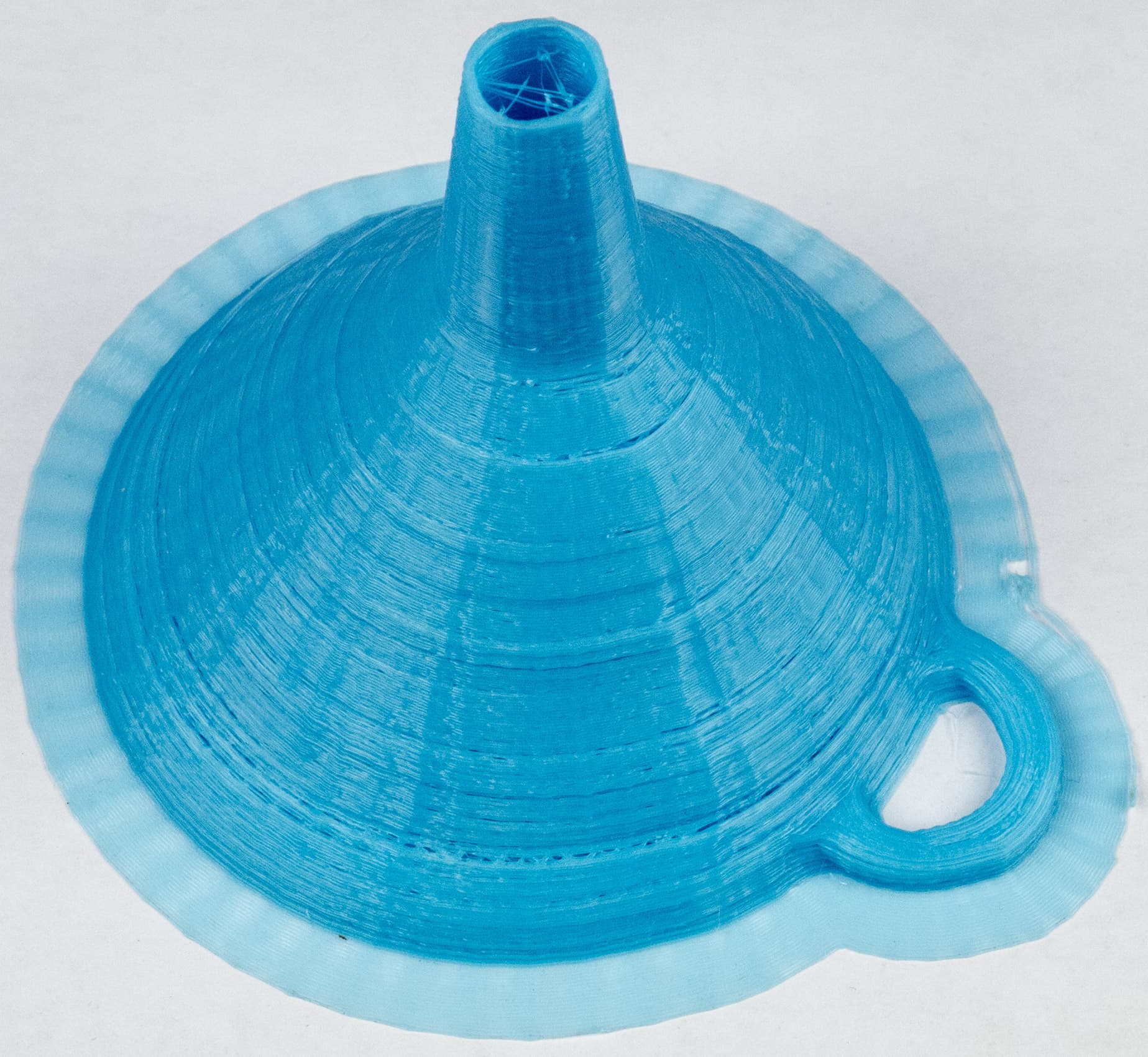 Воронка напечаталась так, что ее «подошва» (с каймой) нигде не отстала от платформы, однако оценить результат можно лишь на троечку, да и то с натяжкой: вместо четкого конуса получилась фигура, деформированная по оси Y сначала заметно вправо, а потом немного влево.