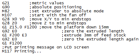 Еще один вариант — открыть с комплектной карты памяти (например, в «Блокноте») файлы gcode двух моделей: можно надеяться, что уж они-то оптимизированы для использования с данным принтером. Оказывается, что начало и конец кода ближе к установкам по умолчанию, чем к рекомендациям инструкции, хотя еще и дополнены, причем есть комментарии к каждой строчке. Приводим фрагмент начала кода для ракеты: