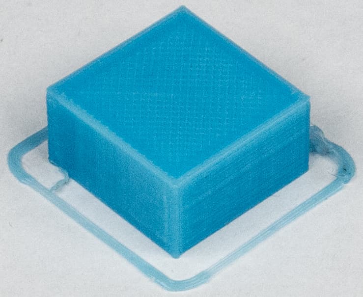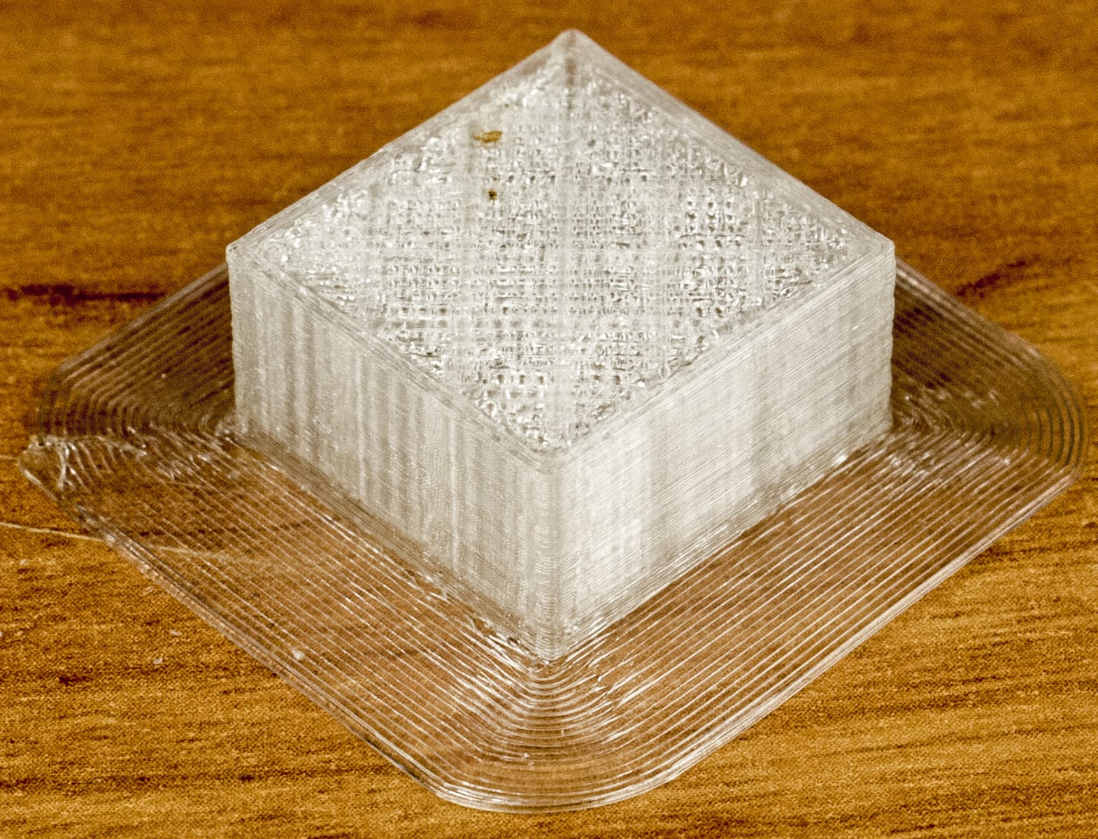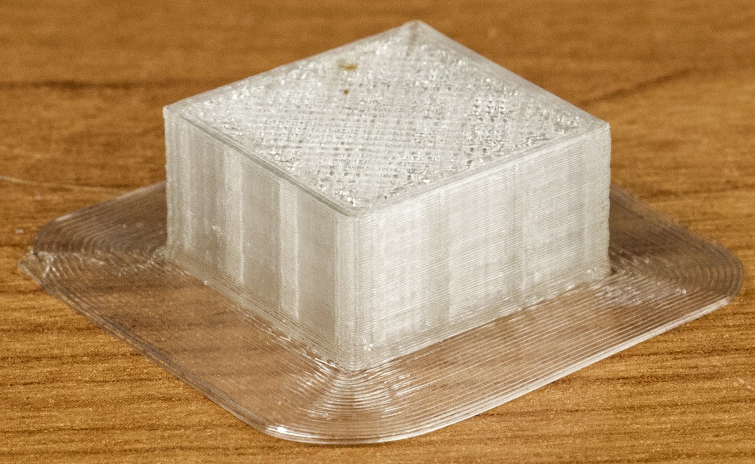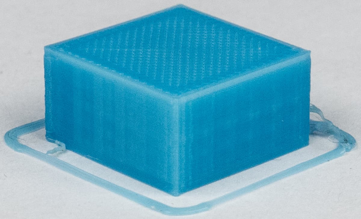 Печатался брусок 20×20×10 мм, с «юбкой». Установлены скорости печати 40 мм/с и вентилятора 60%, если не указано иное.