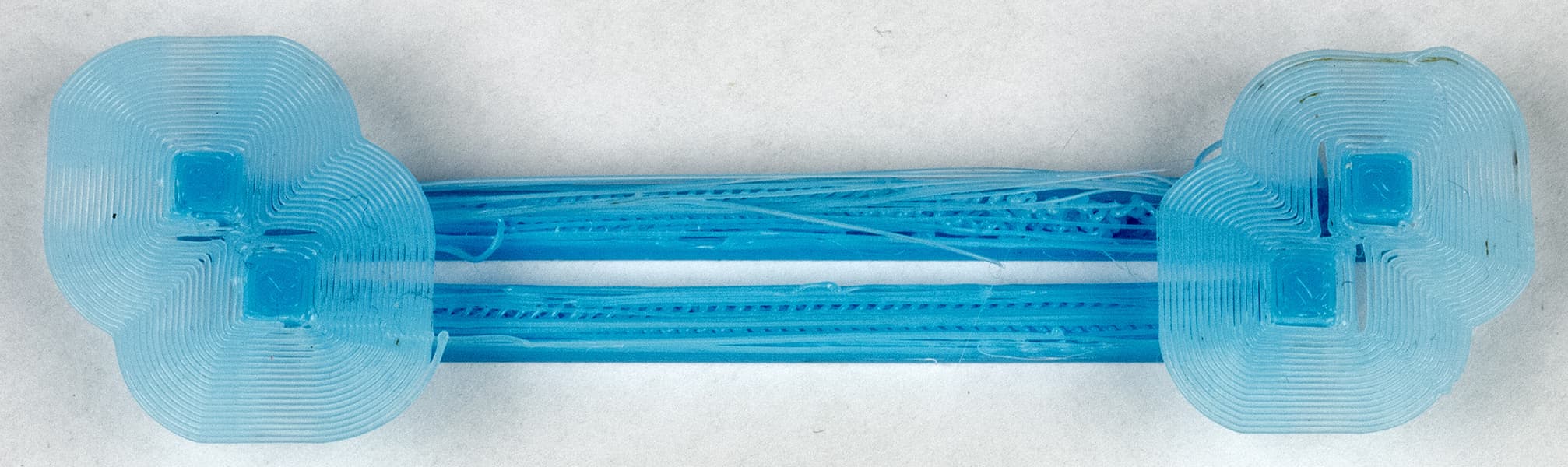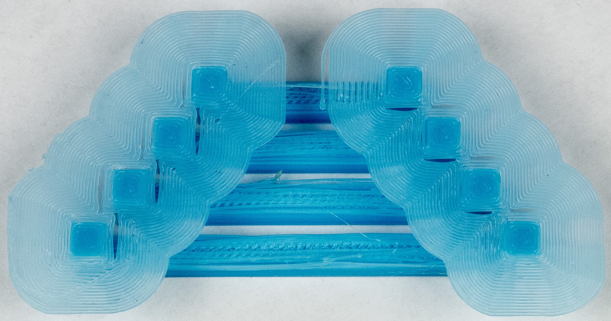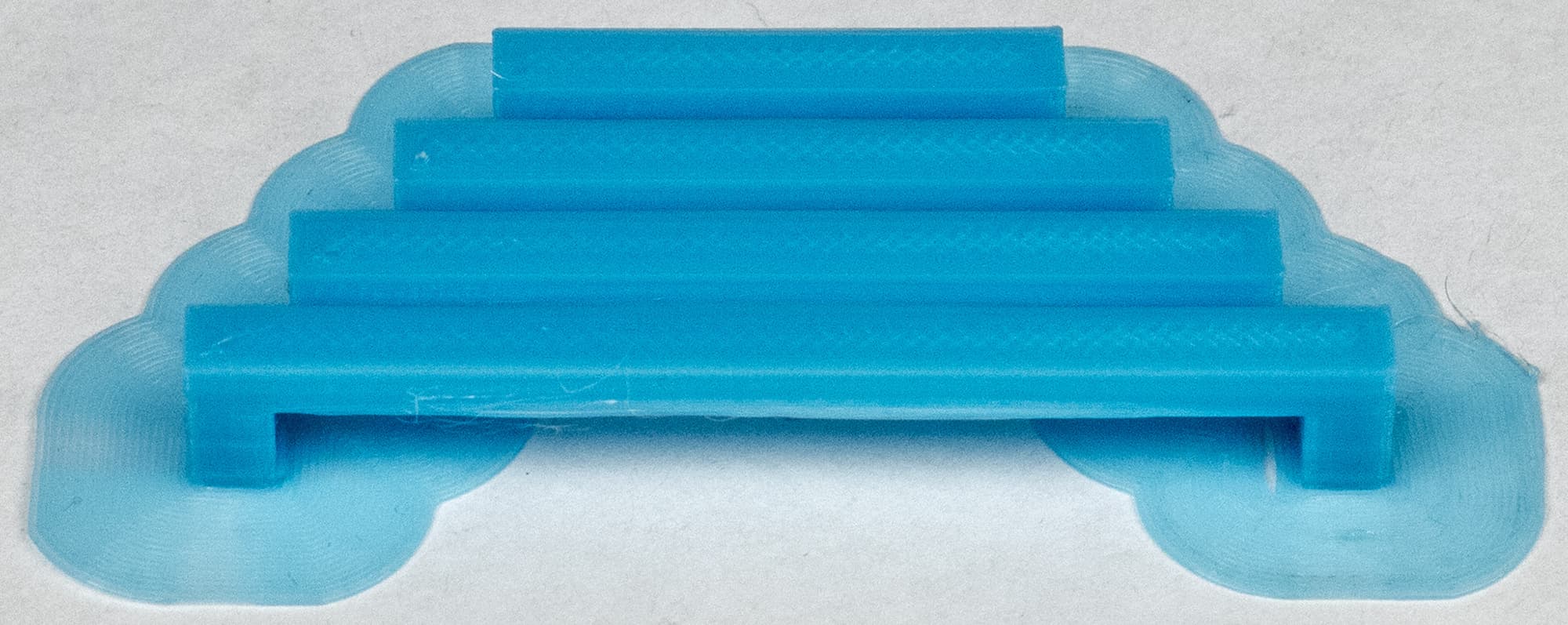 Мосты из PLA — четыре коротких (200 °C, слой 0,15 мм, скорость печати 40 мм/с, вентилятор 100%, с каймой) получаются не идеальными, но довольно приличными даже при значительной длине горизонтальной части: конечно, на первом ее слое есть провисающие нитки, но их относительно немного.