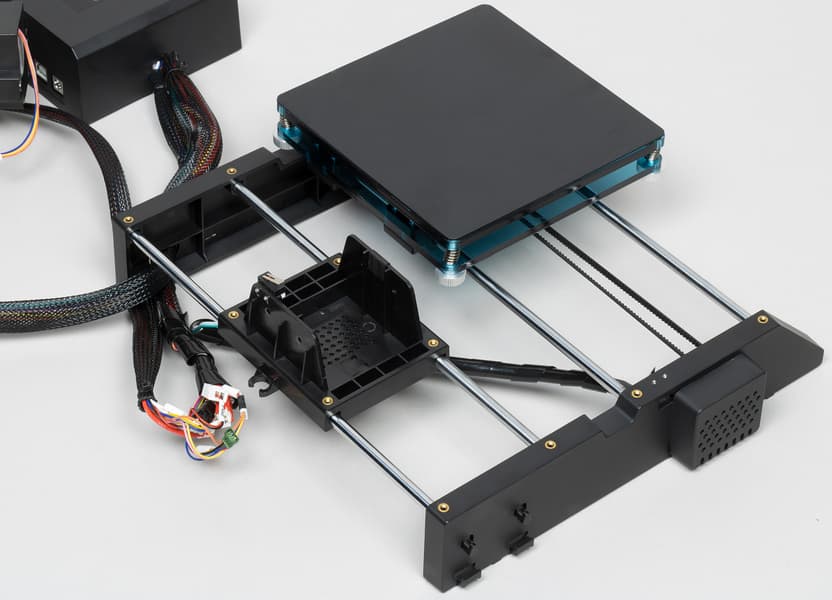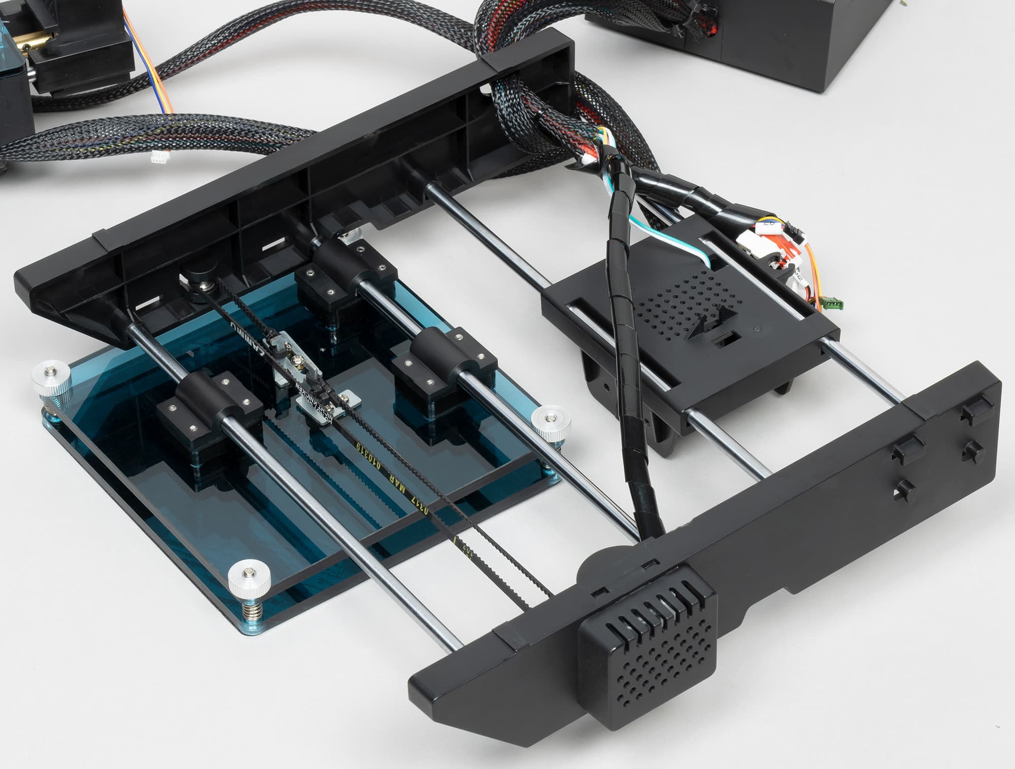 Основание принтера состоит из двух пластиковых боковин, соединенных четырьмя стальными цилиндрическими направляющими диаметром по 6 миллиметров. По двум из них с помощью зубчатого ремня перемещается платформа (ось Y), еще две служат для крепления остальных частей печатающего механизма. Прочность на изгиб у такого основания ожидаемо низкая.