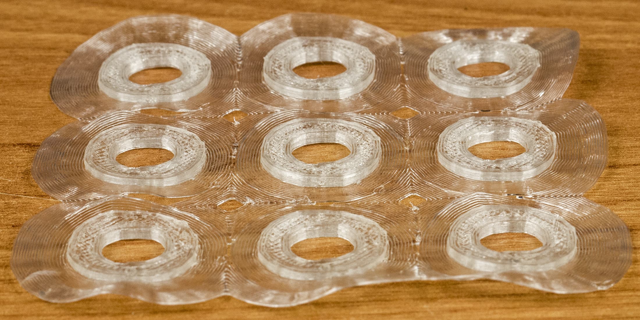Несмотря на значительную площадь соприкосновения с платформой — кайма получилась общей для всех шайб, края на значительной части периметра все же выгнулись, приподнявшись над столиком (кое-где очень сильно), в результате большинство шайб получились дефектными. Но даже у самого лучшего экземпляра внешняя и внутренняя окружности получились далеким от идеально круглых, скорее это многогранники, причем несколько искривленные.