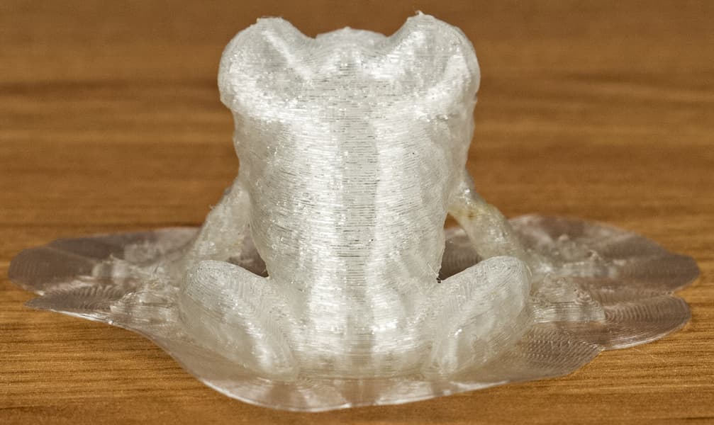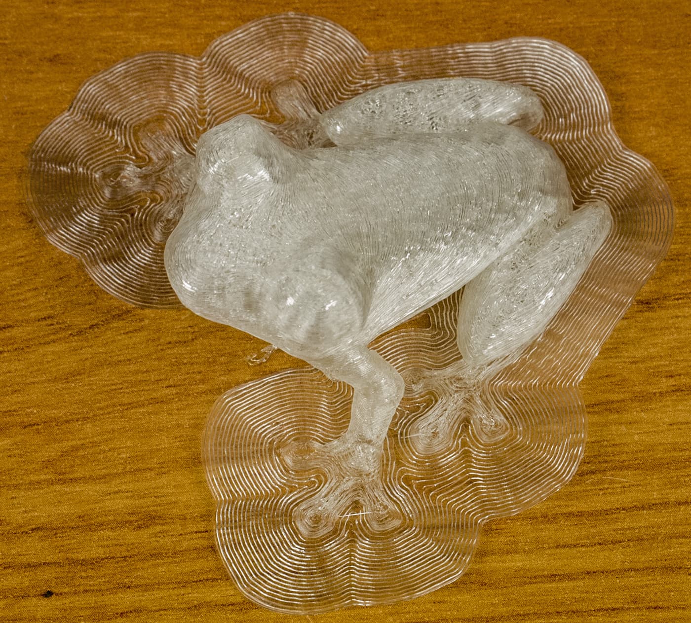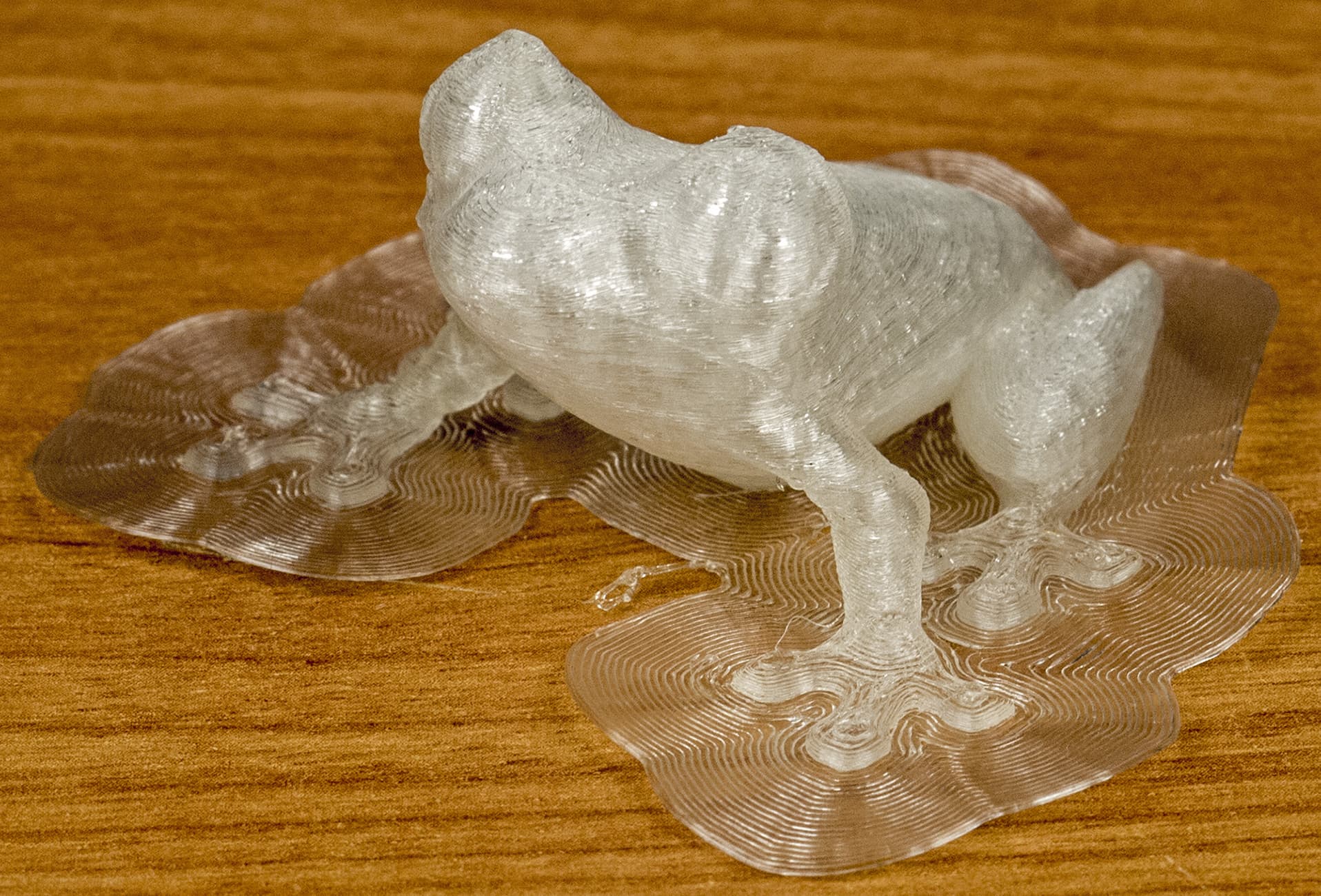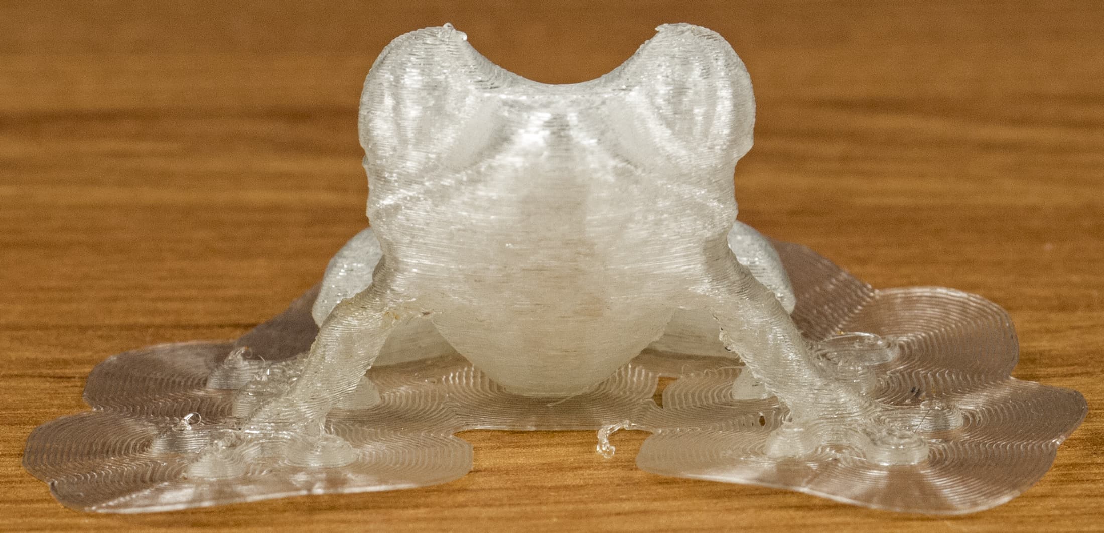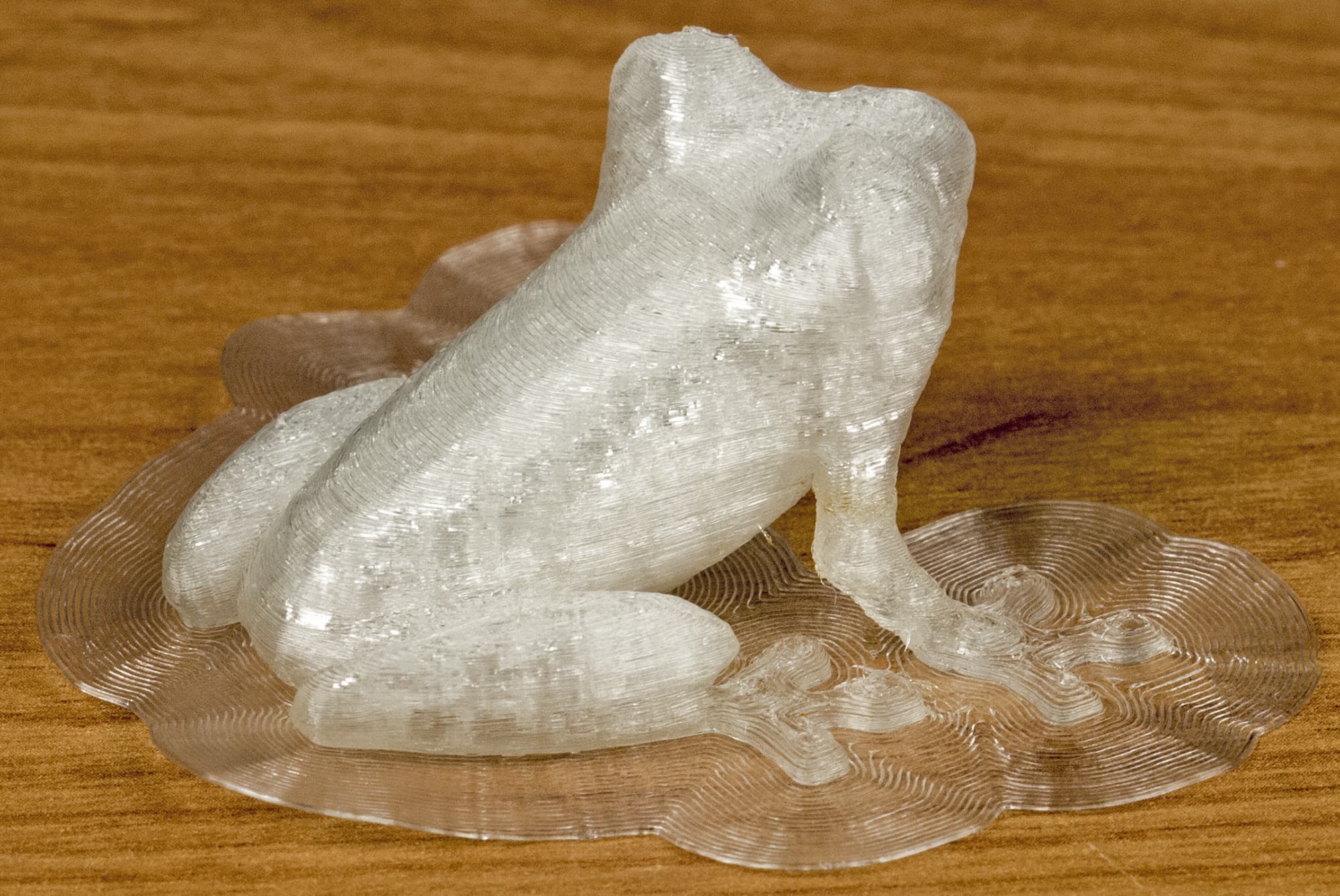 Теперь более сложная модель — лягушка, у которой большое количество нависающих элементов. Ее мы попробовали напечатать из FLEX с установками: 255 °C, кайма, скорость 40 мм/с, вентилятор выключен, заполнение 25% сеткой, слой 0,2 мм. Оценка времени 53 минуты, реально получилось 4 часа 37 минут.