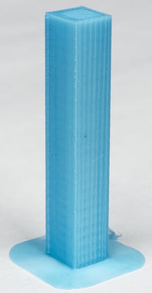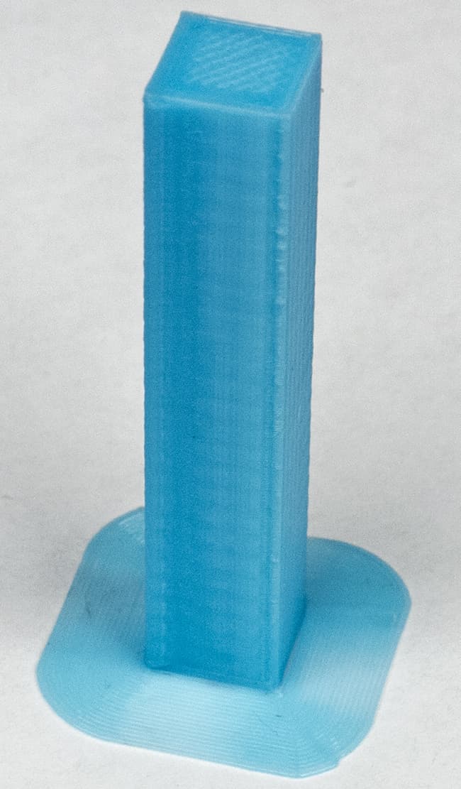 Вытянутый вверх столбик 10×10 мм в основании и 50 мм в высоту (PLA, 200 °C, слой 0,15 мм, скорость печати 60 мм/с, вентилятор выключен, заполнение 20% сеткой, с каймой), оценка времени 19 минут, реально 1 час 19 минут. Получилось вполне аккуратно, если придираться — углы чуть скруглены, но для данной технологии 3D-печати это неизбежно.