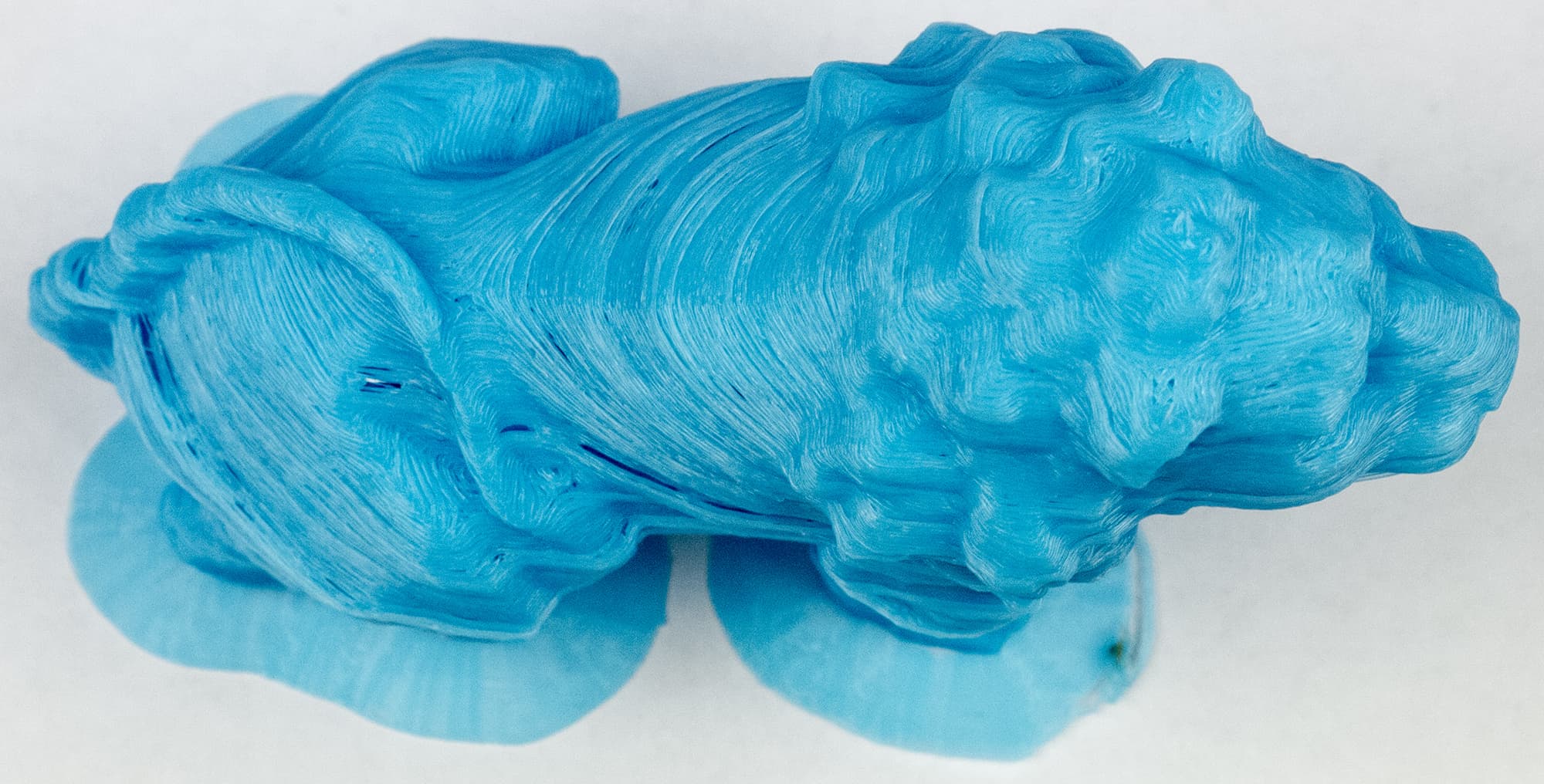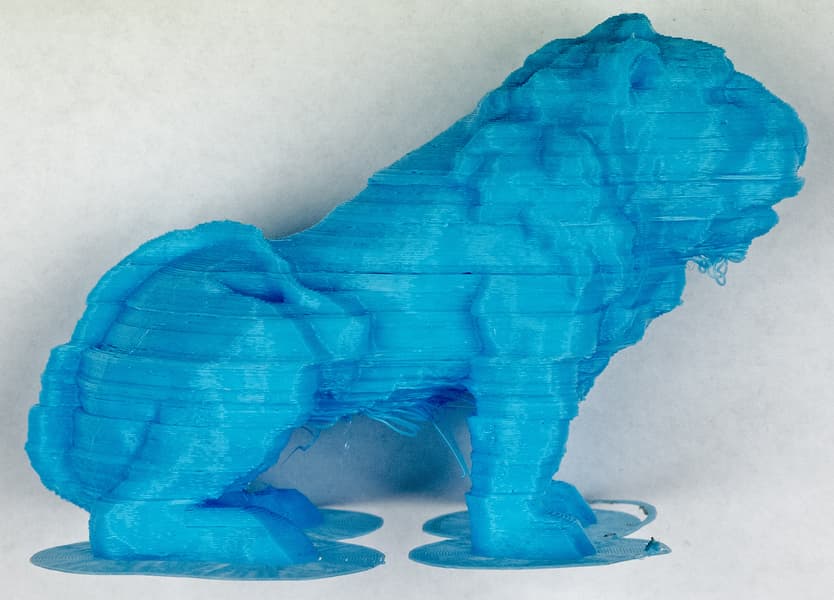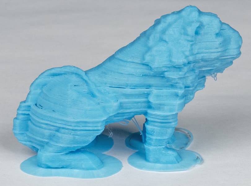 Еще более сложная фигура — сидящий лев с прямыми передними лапами, у которого не имеют опоры живот, грудь и морда; по конфигурации похоже на лягушку, но и сама модель, и нависающие элементы заметно крупнее. Пробуем напечатать из PLA с установками: 200 °C, кайма, скорость 60 мм/с, вентилятор выключен, заполнение 15% шестигранниками, слой 0,2 мм, без поддержек. Время печати программа оценила в 1 час 43 минуты, реально процесс шел 11 часов 29 минут (снова шестикратная ошибка!).