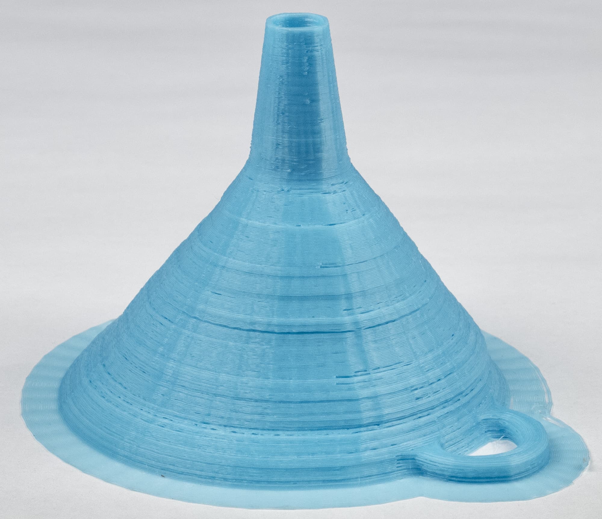 Воронка: деталь большая, но с малой площадью основания, соприкасающегося с платформой. То есть вероятность отрыва, хотя бы частичного (и с последующим искажением дальнейших слоев), от стола очень велика.