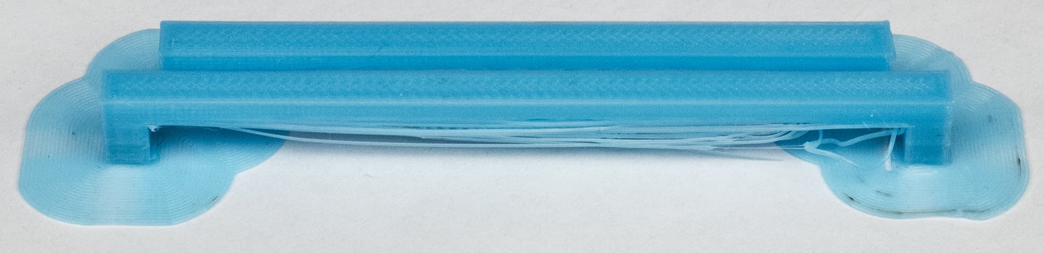 Мосты из PLA — два длинных (195 °C, слой 0,15 мм, скорость печати 60 мм/с, вентилятор 100%, заполнение 20% сеткой, с каймой), оценка времени 19 минут, реально 1 час 13 минут. Самый длинный мост получился откровенно плохо: внизу очень много провисающих ниток, но тот, что чуть короче, выглядит более приемлемо.