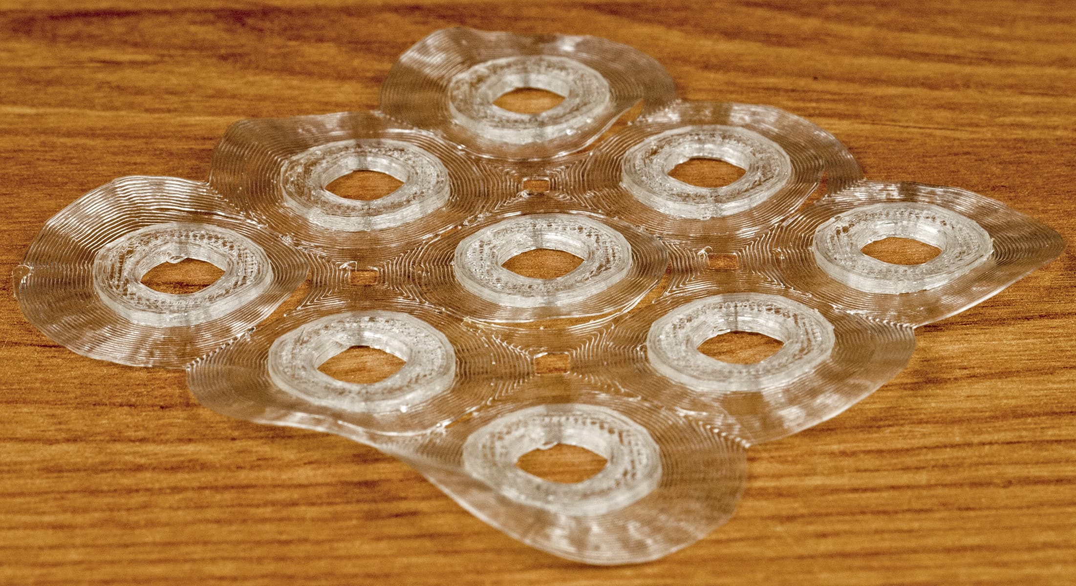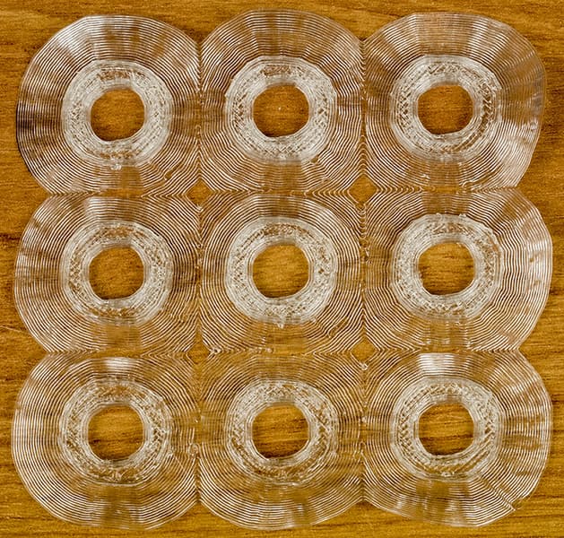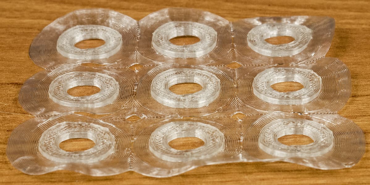 Чтобы от принтера была хоть какая-то реальная польза, а не только абстрактные тестовые фигурки, мы напечатали из FLEX круглые шайбы (они потребовались в хозяйстве) — самые обычные, внешним диаметром 18 мм, с отверстием 8 мм, толщиной 2 мм, девять штук за один сеанс. Чтобы изделия получились прочными, задали такие параметры: заполнение 50% линиями, слой 0,15 мм, 255 °C, скорость 50 мм/с, вентилятор выключен.