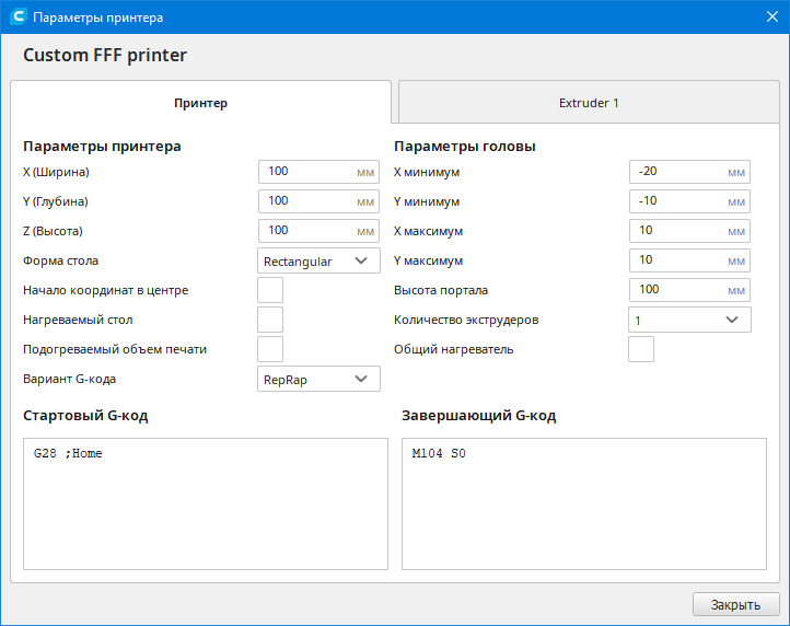 Сразу вызывают недоумение рекомендуемые установки ширины, глубины, высоты: и без того рабочий объем небольшой — 120 мм по каждой из осей, а здесь и вовсе задается по 100 мм, да еще часть при отображении в Cura отмечается серым, и если расположить модель с заходом в эту серую зону, то нарезка на слои станет невозможной.