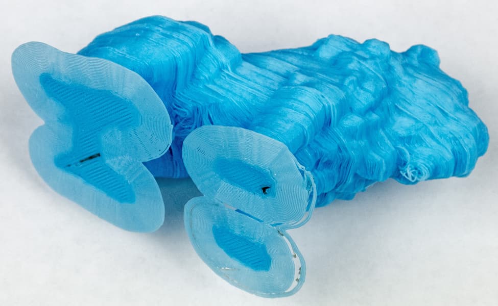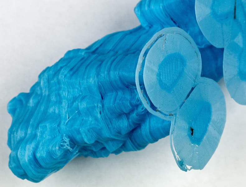 И, конечно, есть дефекты нависающих частей, что вполне ожидаемо для подобной модели. Да, можно подбирать режимы, но, к сожалению, результат любого такого изменения будет заметен лишь после нескольких часов печати. Более действенный метод — включить в настройках создание поддержек, однако это существенно увеличит продолжительность печати и расход нити, а также заставит тратить время и силы на финишную обработку фигурки, связанную с удалением этих поддержек.